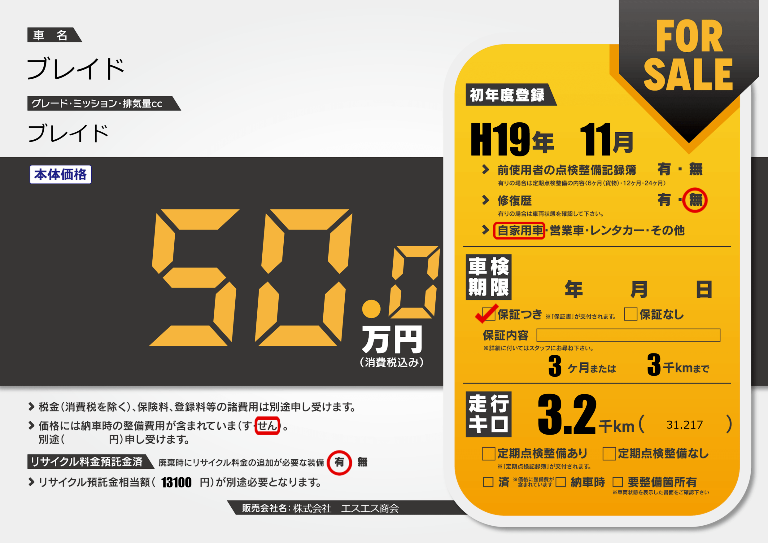 保証付き 保証内容(---) 3ヶ月または(3)千kmまで |
