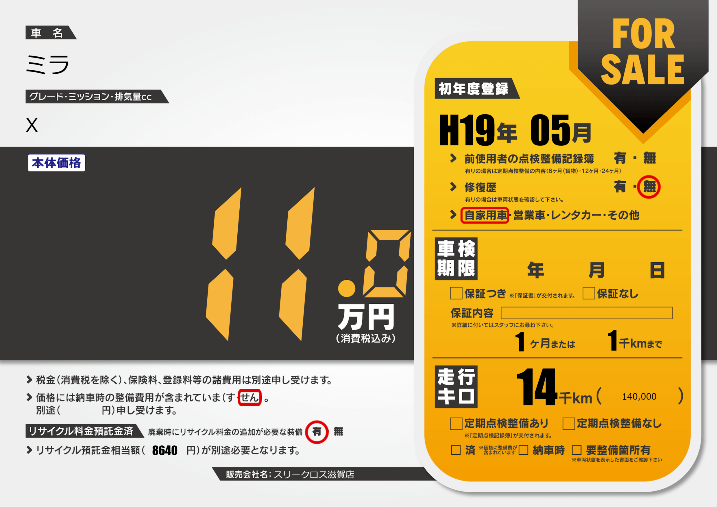 | 車名 | ミラ | グレード ミッション 排気量 |
