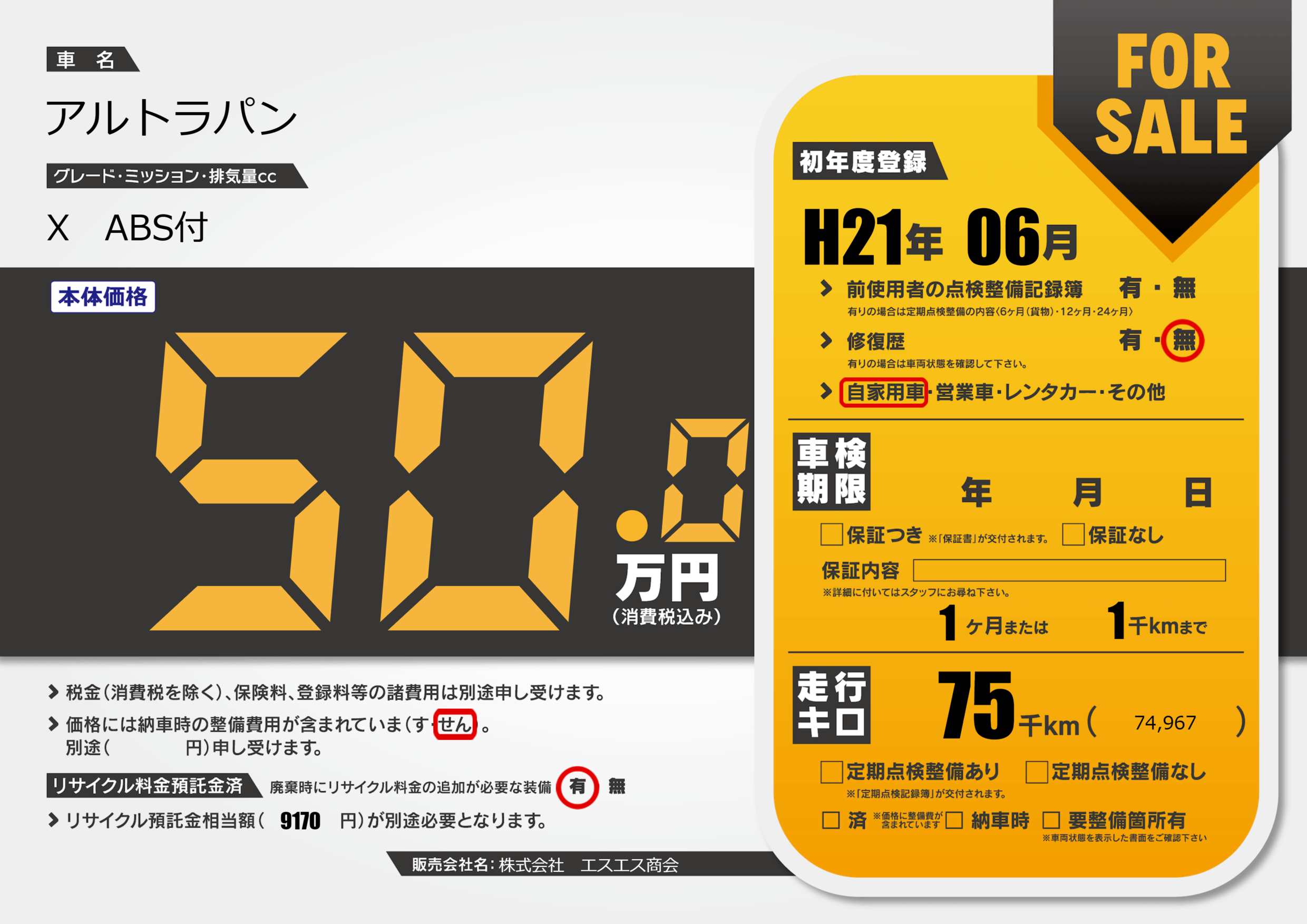 | 走行キロ | 7.5万km | 初年度登録 | H21年06月 |