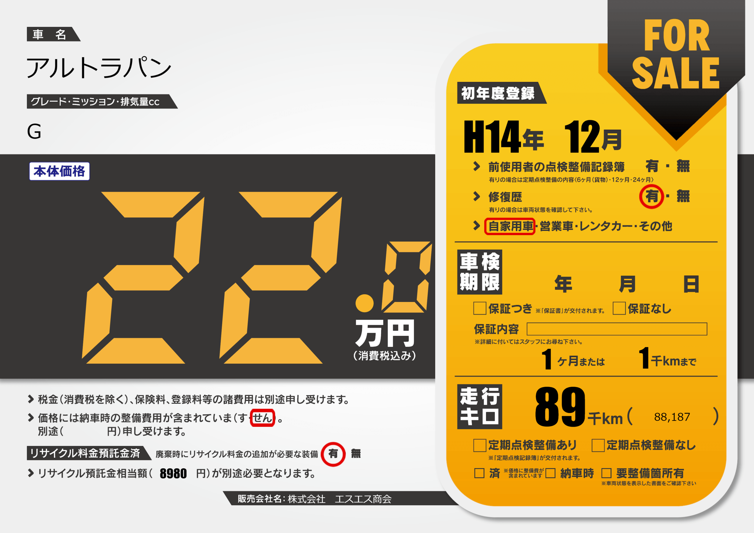 | 走行キロ | 8.9万km | 初年度登録 | H14年12月 |