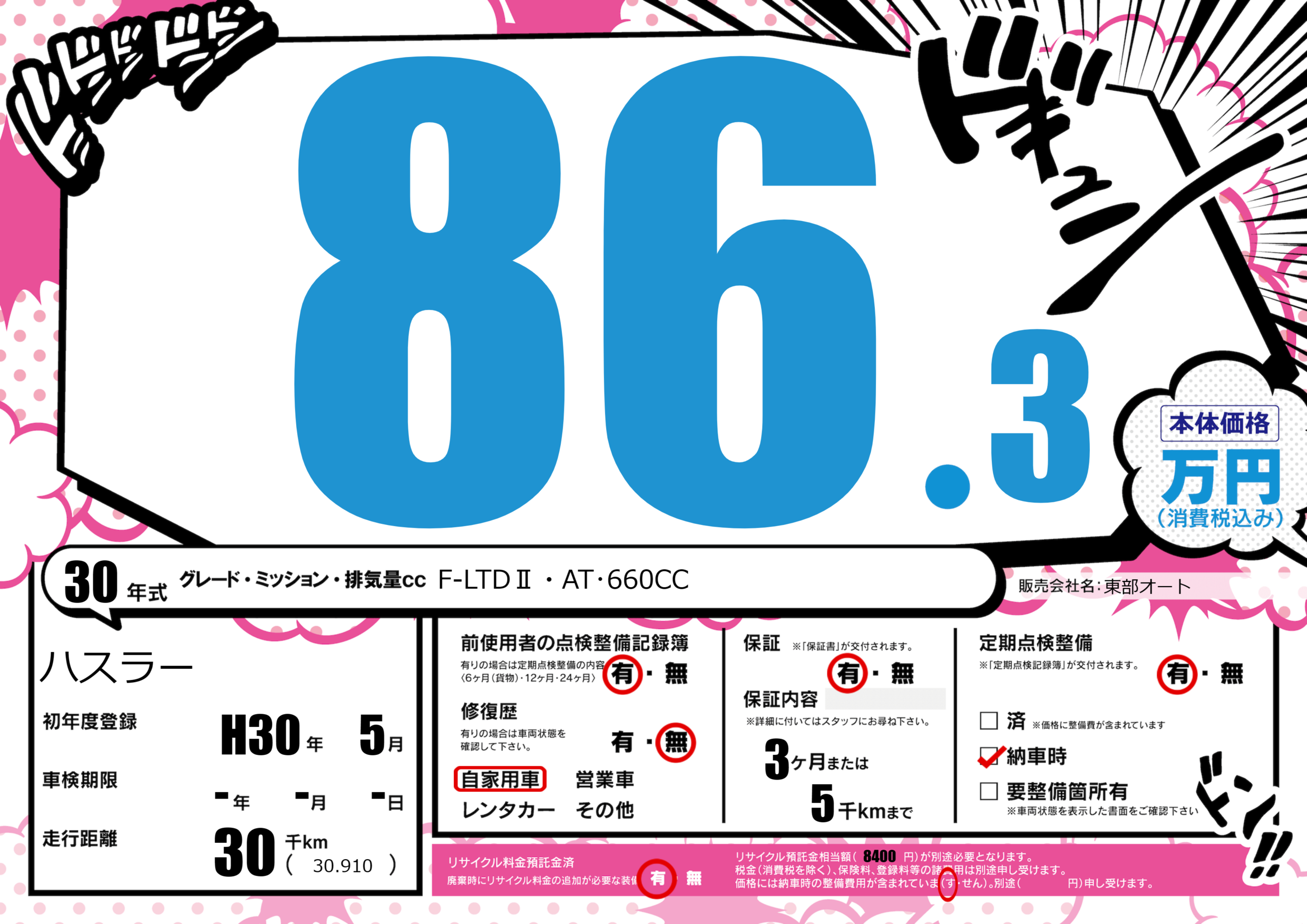 | 車名 | ハスラー | グレード ミッション 排気量 |