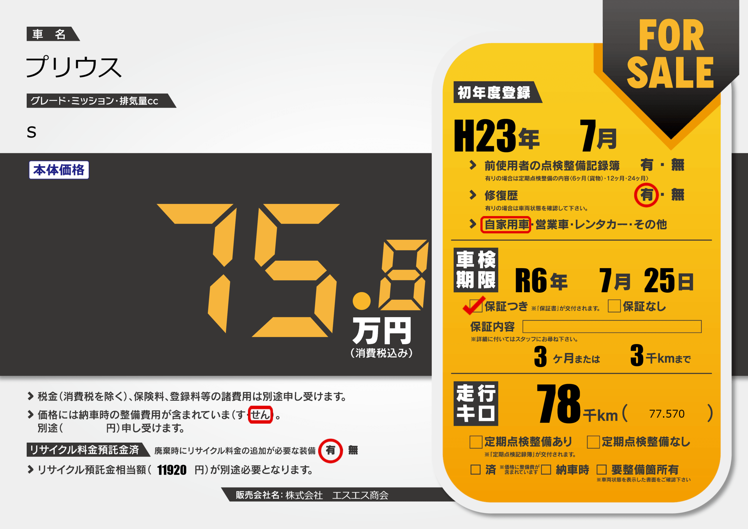 | 車名 | プリウス | グレード ミッション 排気量 |