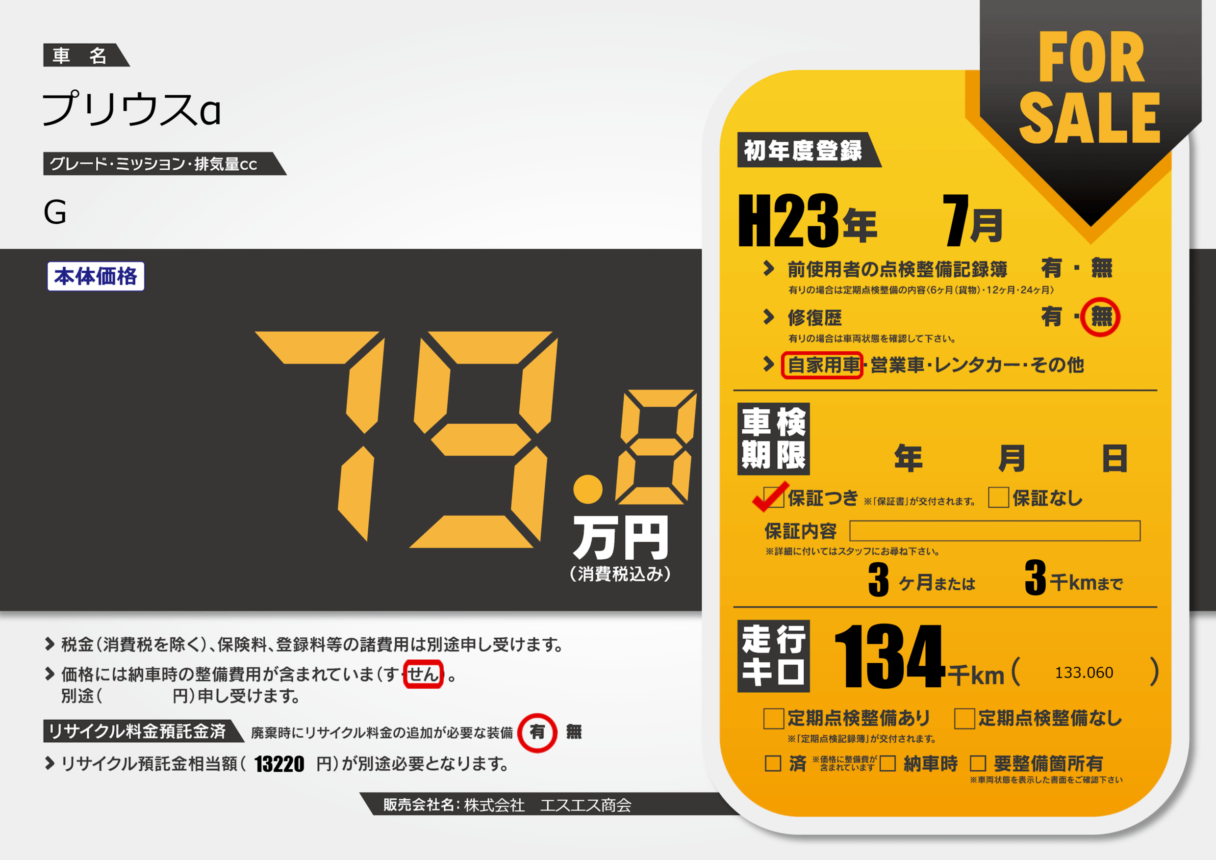 | 走行キロ | 13.4万km | 初年度登録 | H23年7月 |