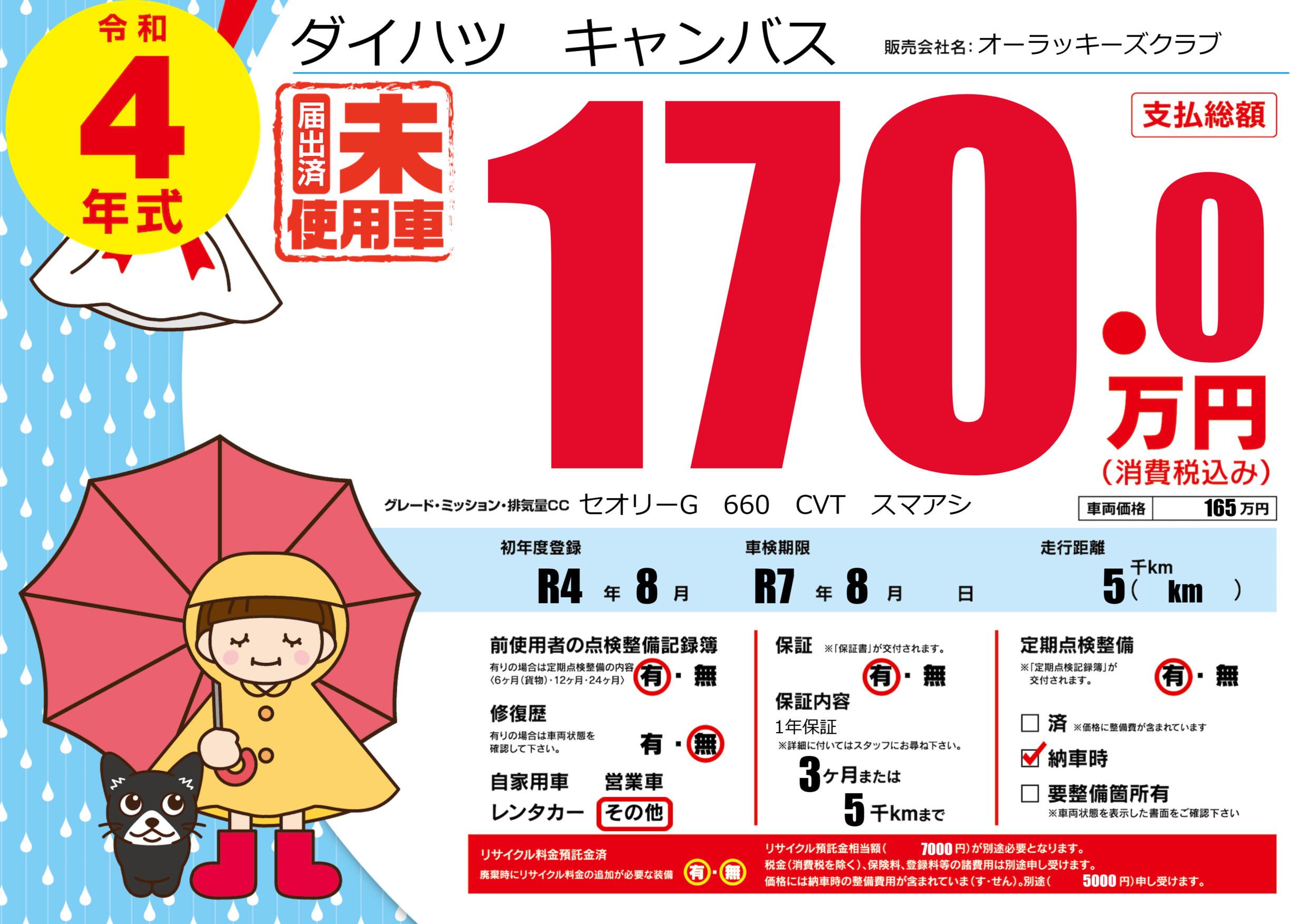 | 走行キロ | 0.5万km | 初年度登録 | R4年8月 |