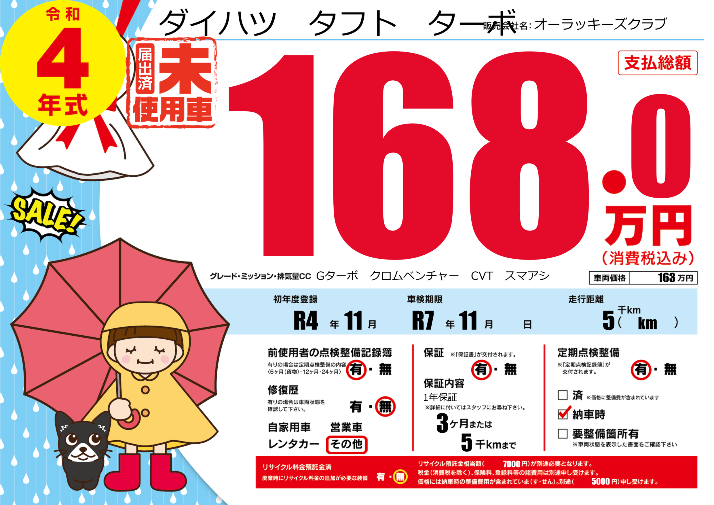 | 走行キロ | 0.5万km | 初年度登録 | R4年11月 |