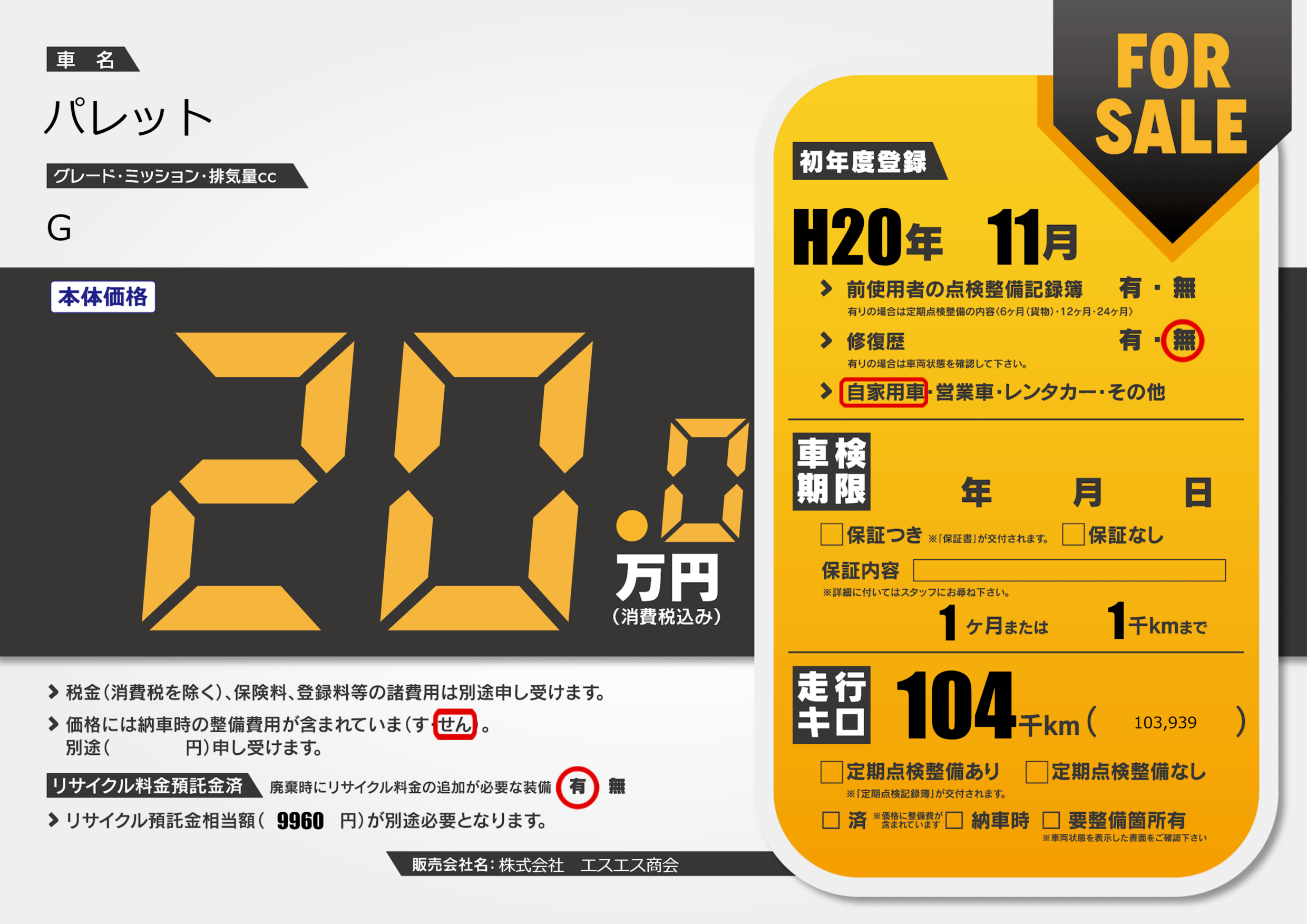 | 走行キロ | 10.4万km | 初年度登録 | H20年11月 |