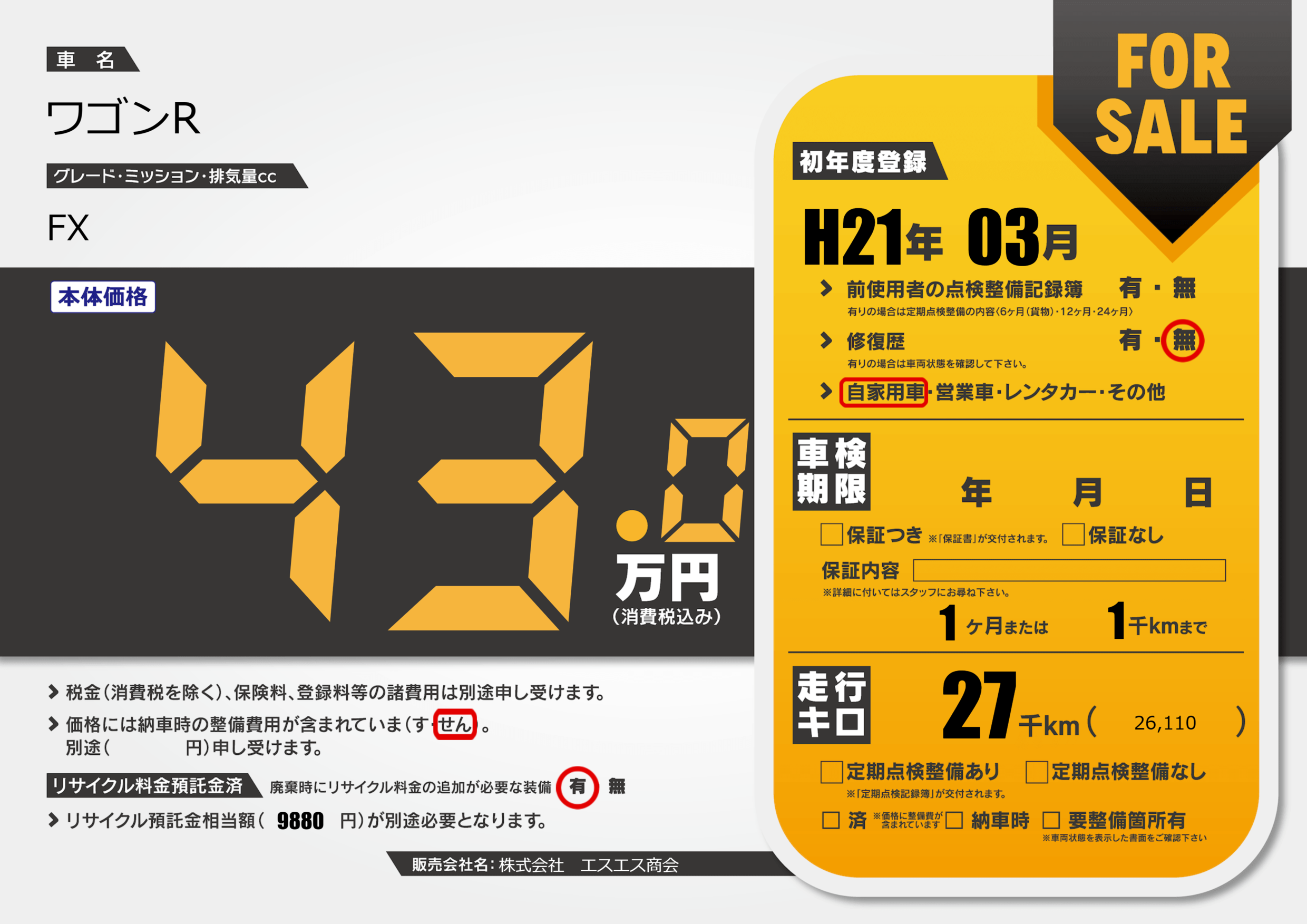| 車名 | ワゴンR | グレード ミッション 排気量 |