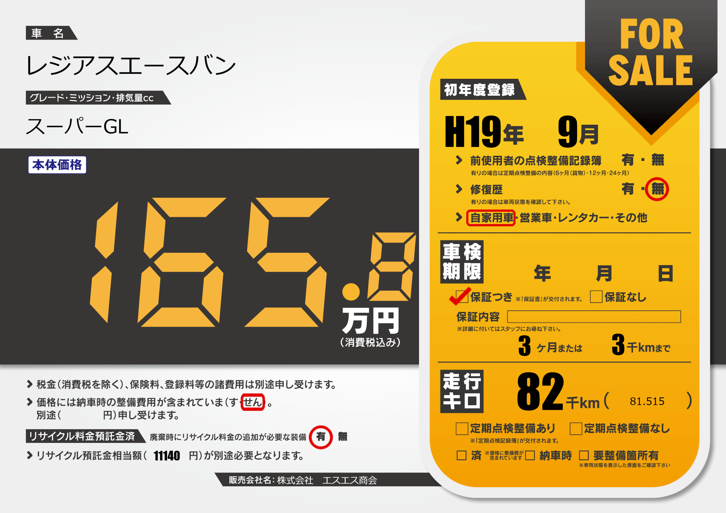 | 車名 | レジアスエースバン | グレード ミッション 排気量 |