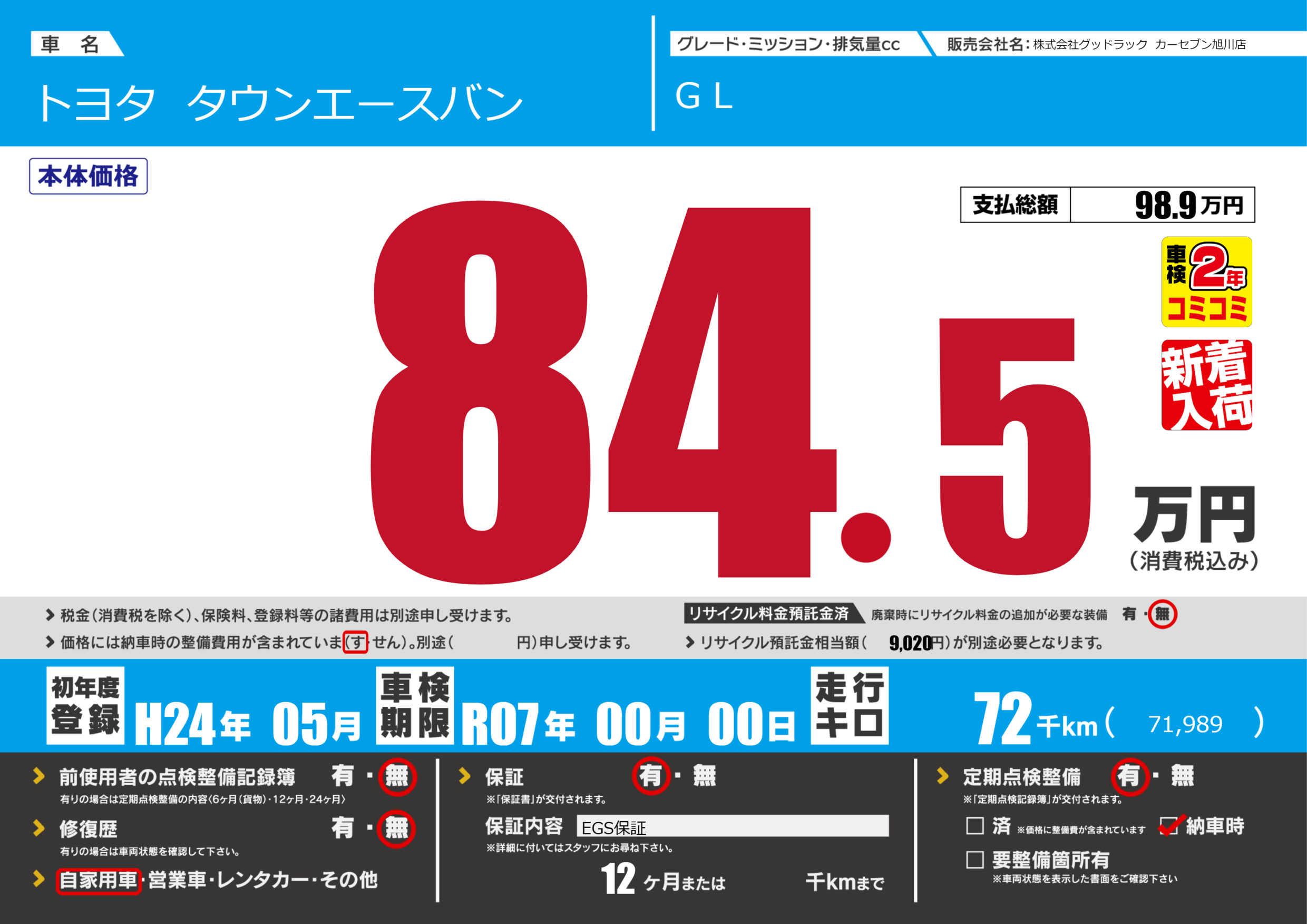 | 車名 | トヨタ タウンエースバン | グレード ミッション 排気量 |
