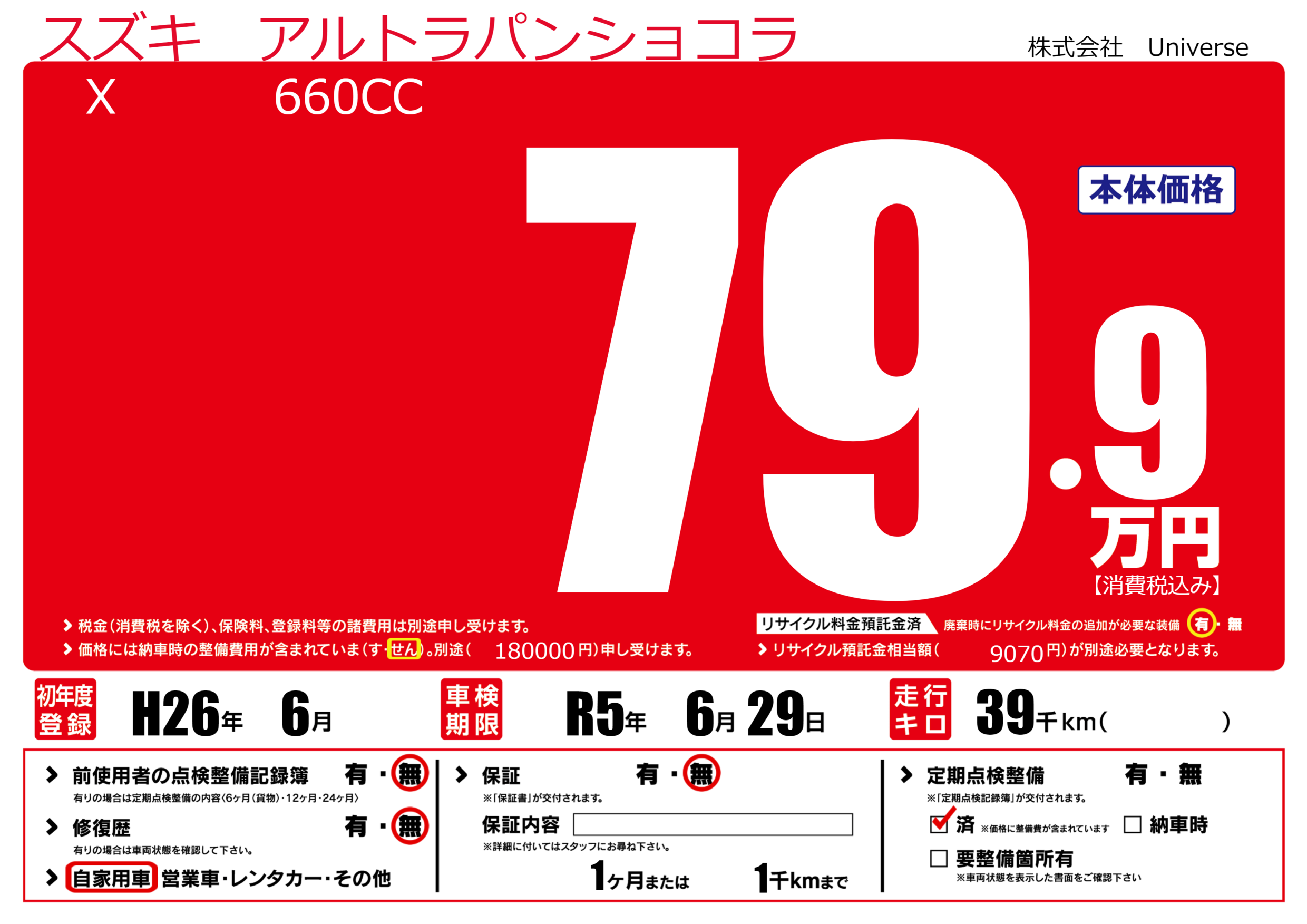 | 走行キロ | 3.9万km | 初年度登録 | H26年6月 |