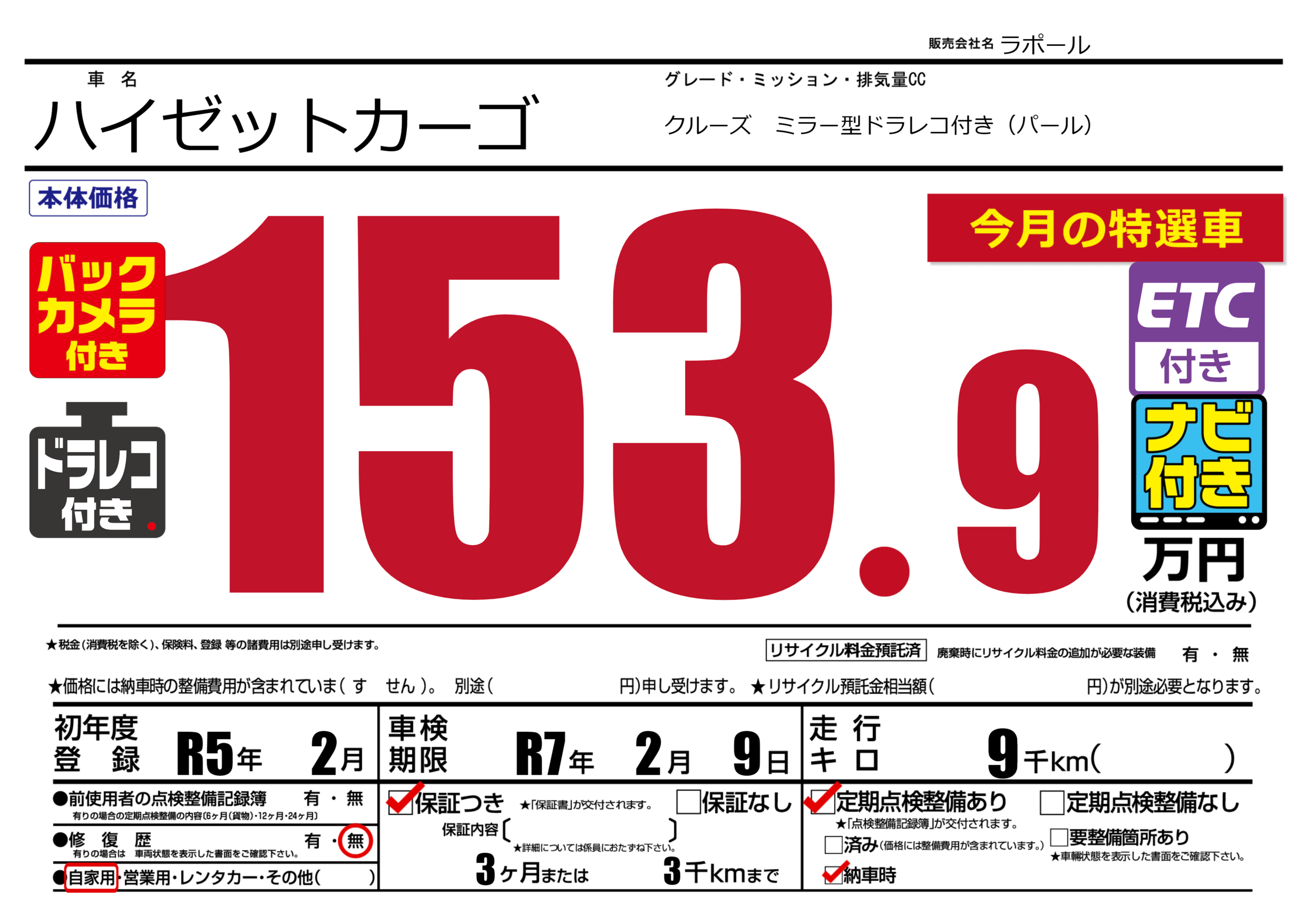 | 走行キロ | 0.9万km | 初年度登録 | R5年2月 |