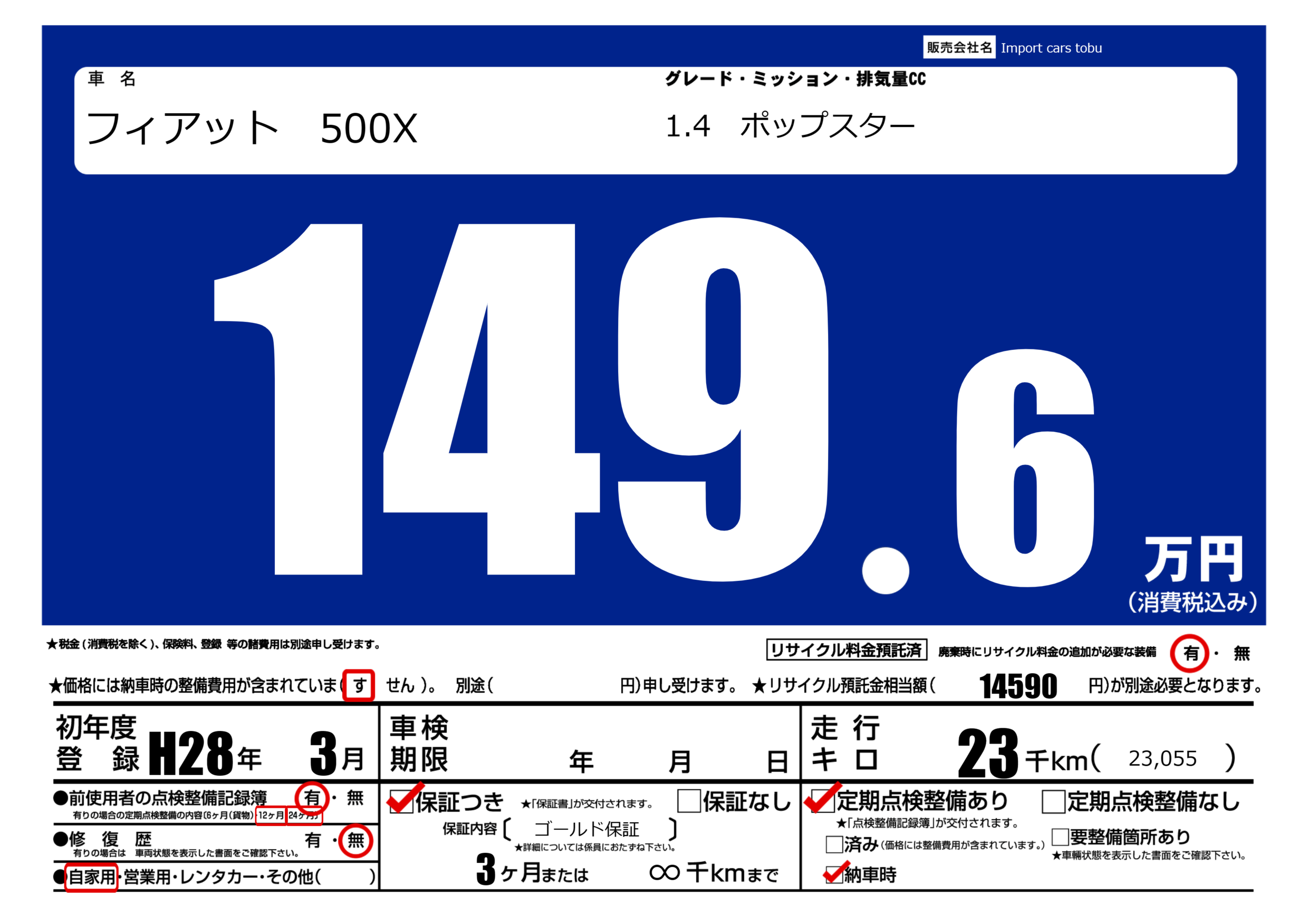 | 車名 | フィアット 500X | グレード ミッション 排気量 |