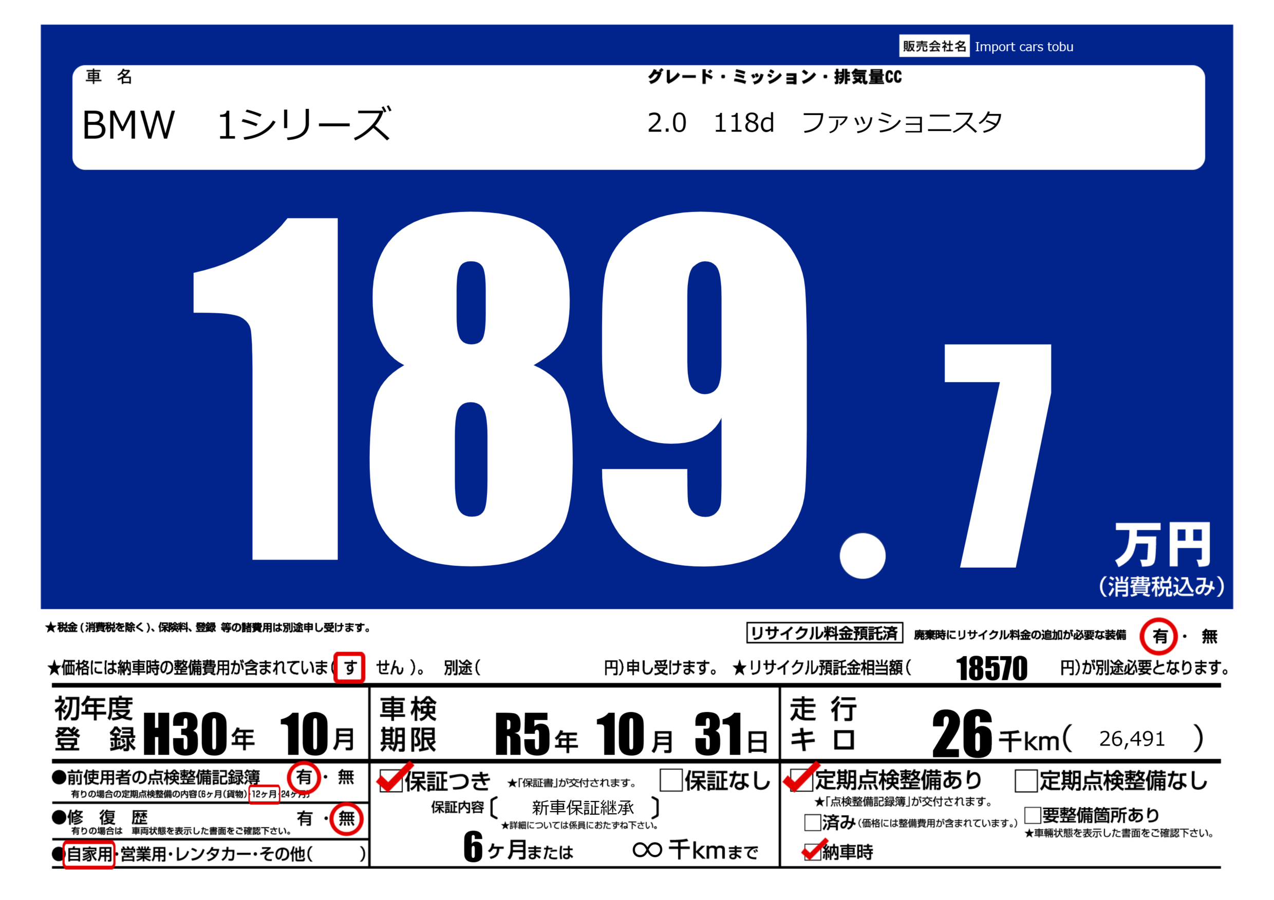 保証付き 保証内容( 新車保証継承) 6ヶ月または(∞)千kmまで |