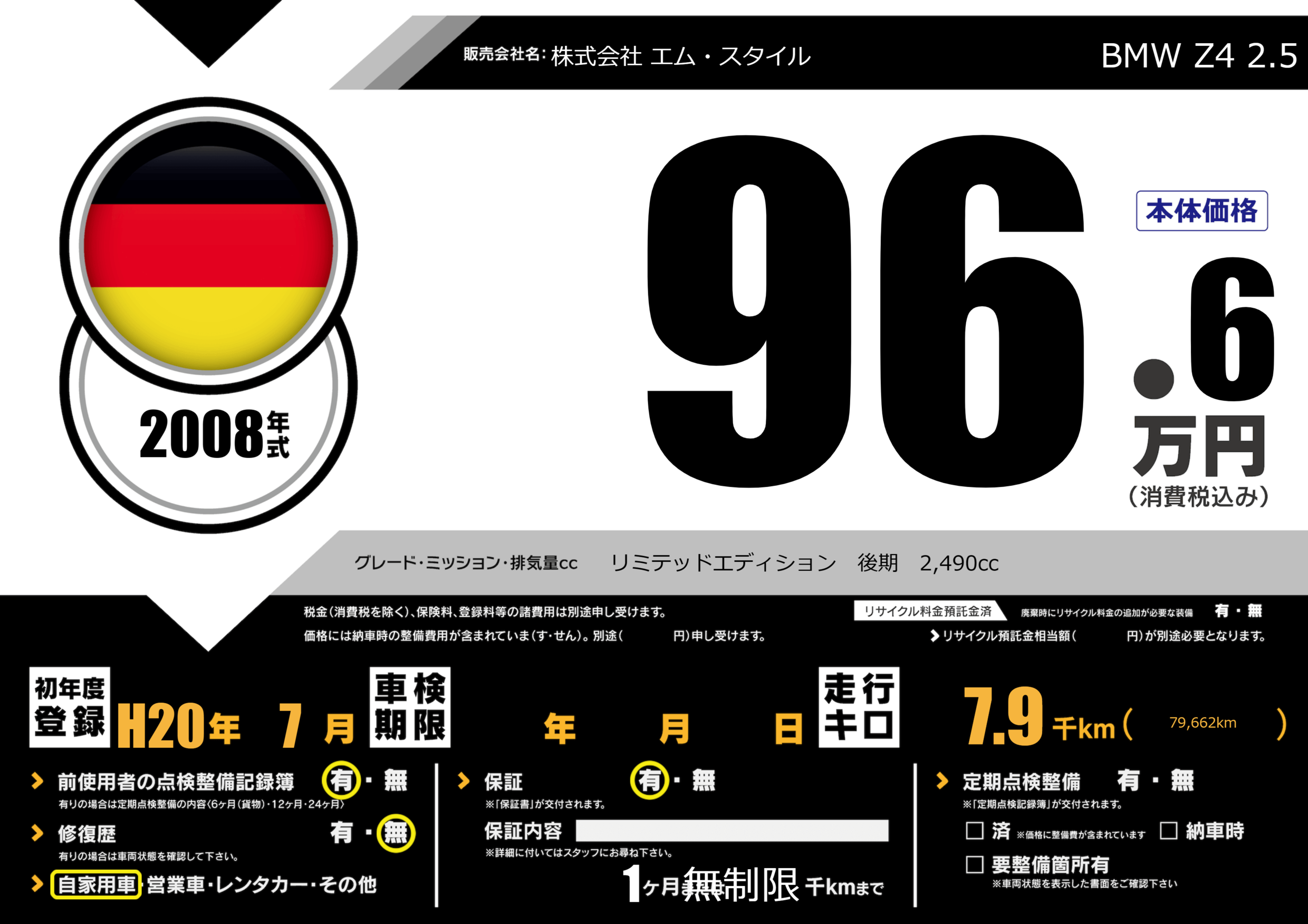 | 車名 | BMW Z4 2.5 | グレード ミッション 排気量 |