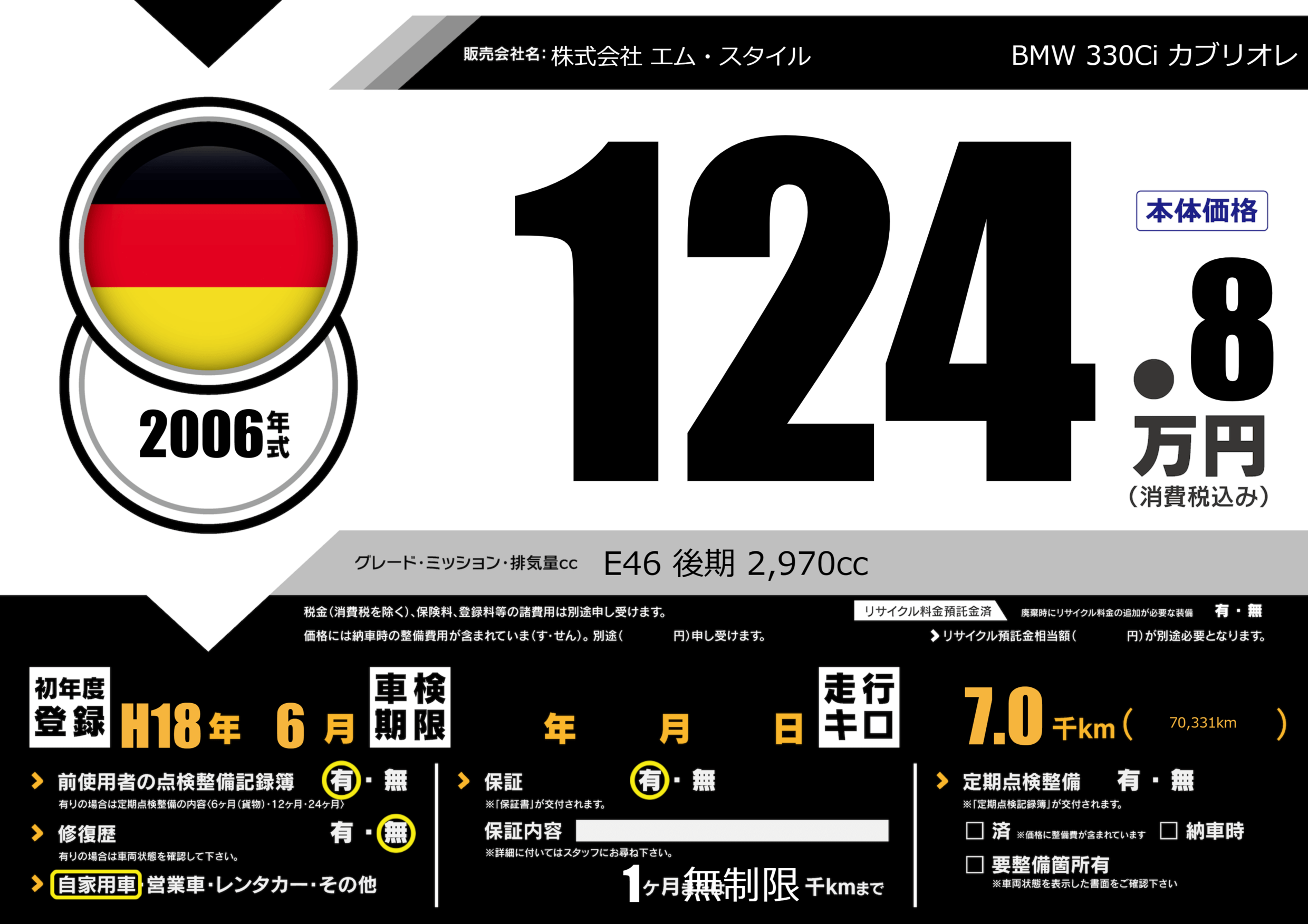 | 車名 | BMW 330Ci カブリオレ | グレード ミッション 排気量 |