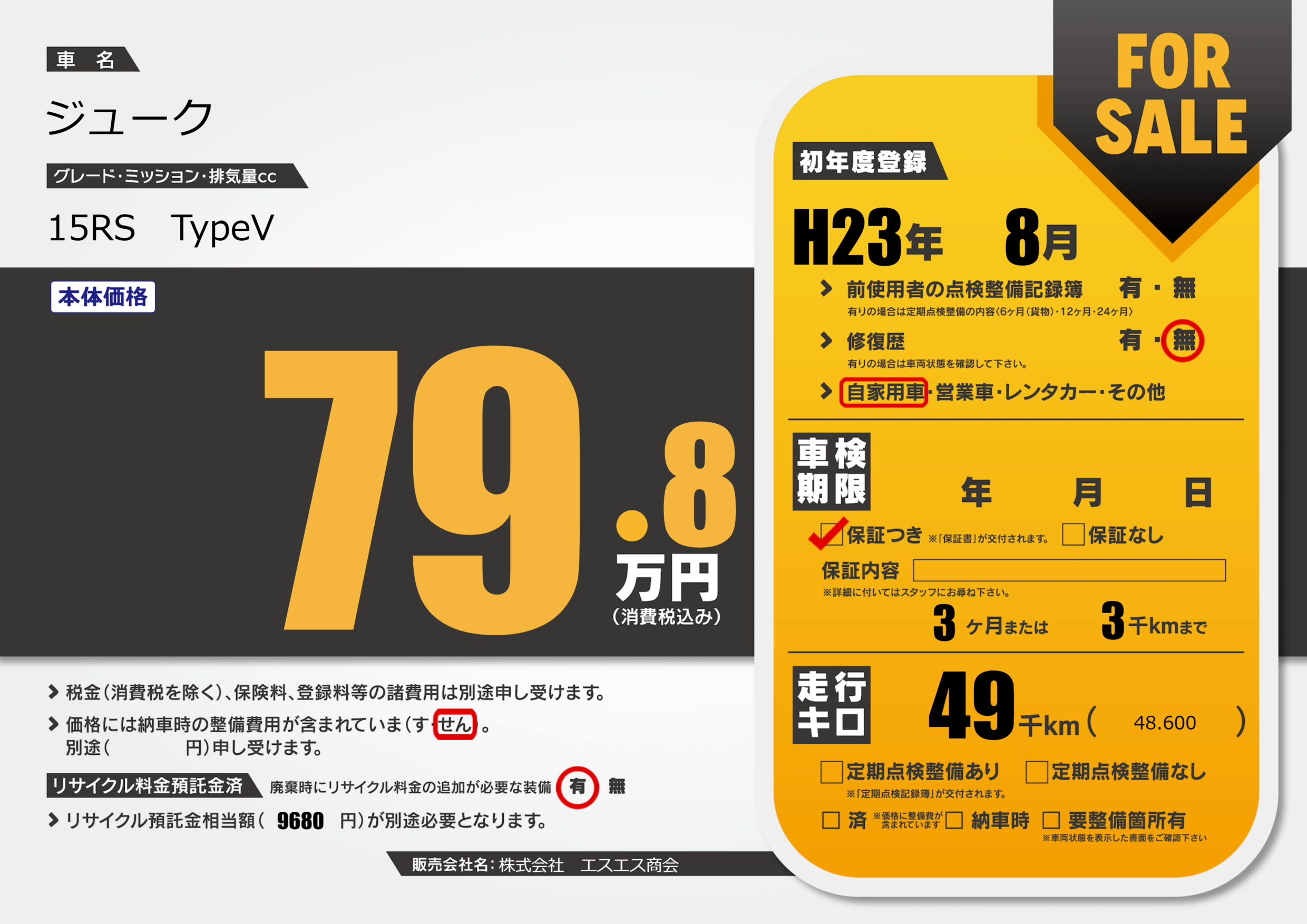 | 走行キロ | 4.9万km | 初年度登録 | H23年8月 |