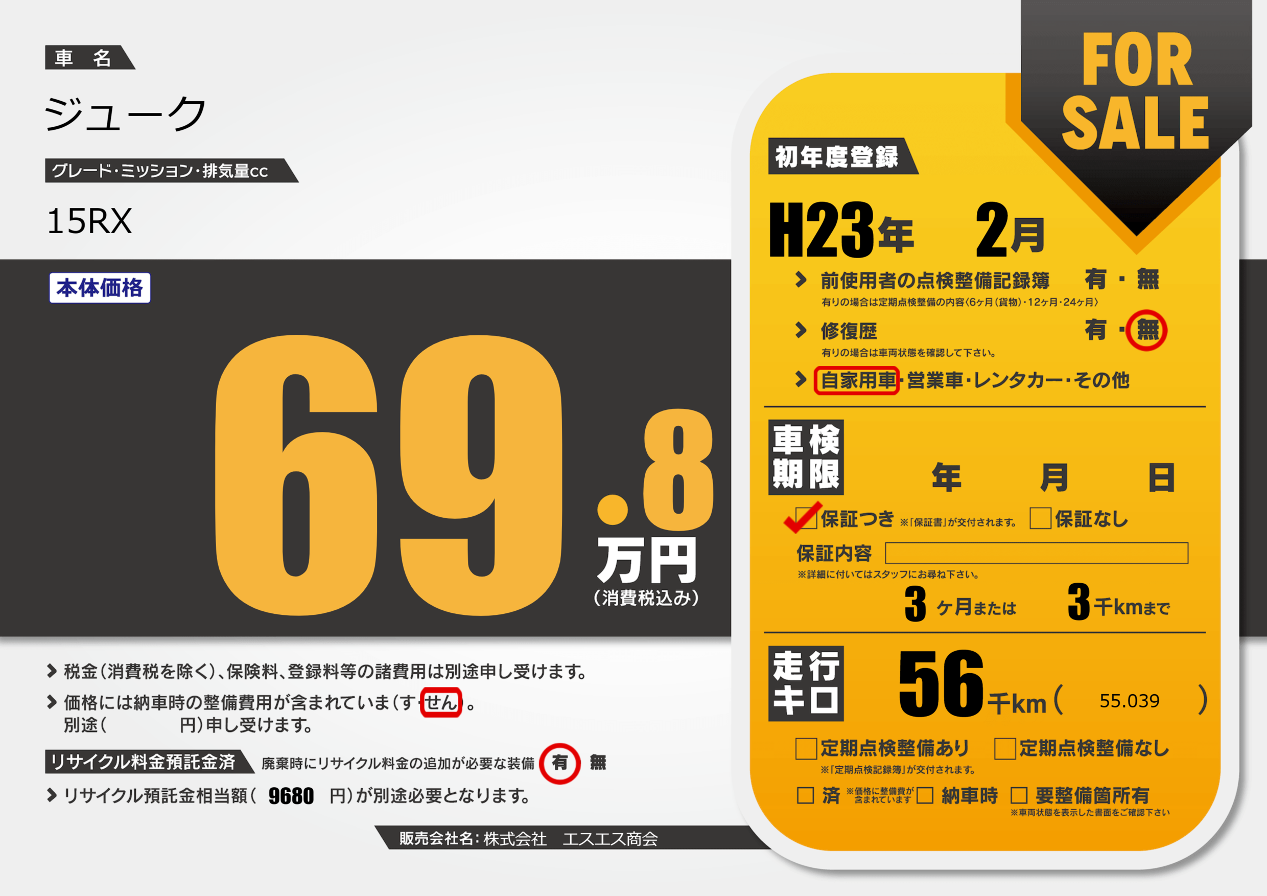 | 車名 | ジューク | グレード ミッション 排気量 |