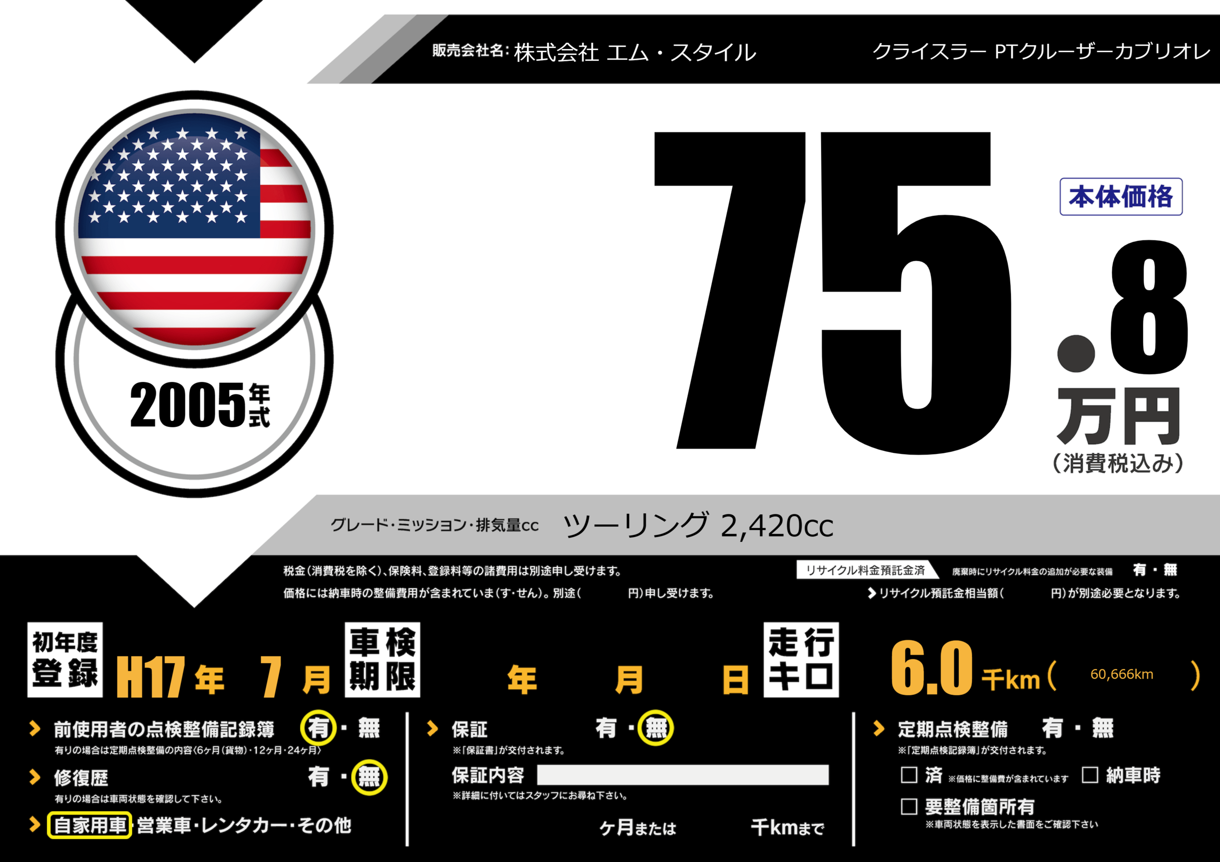| 車名 | クライスラー PTクルーザーカブリオレ | グレード ミッション 排気量 |