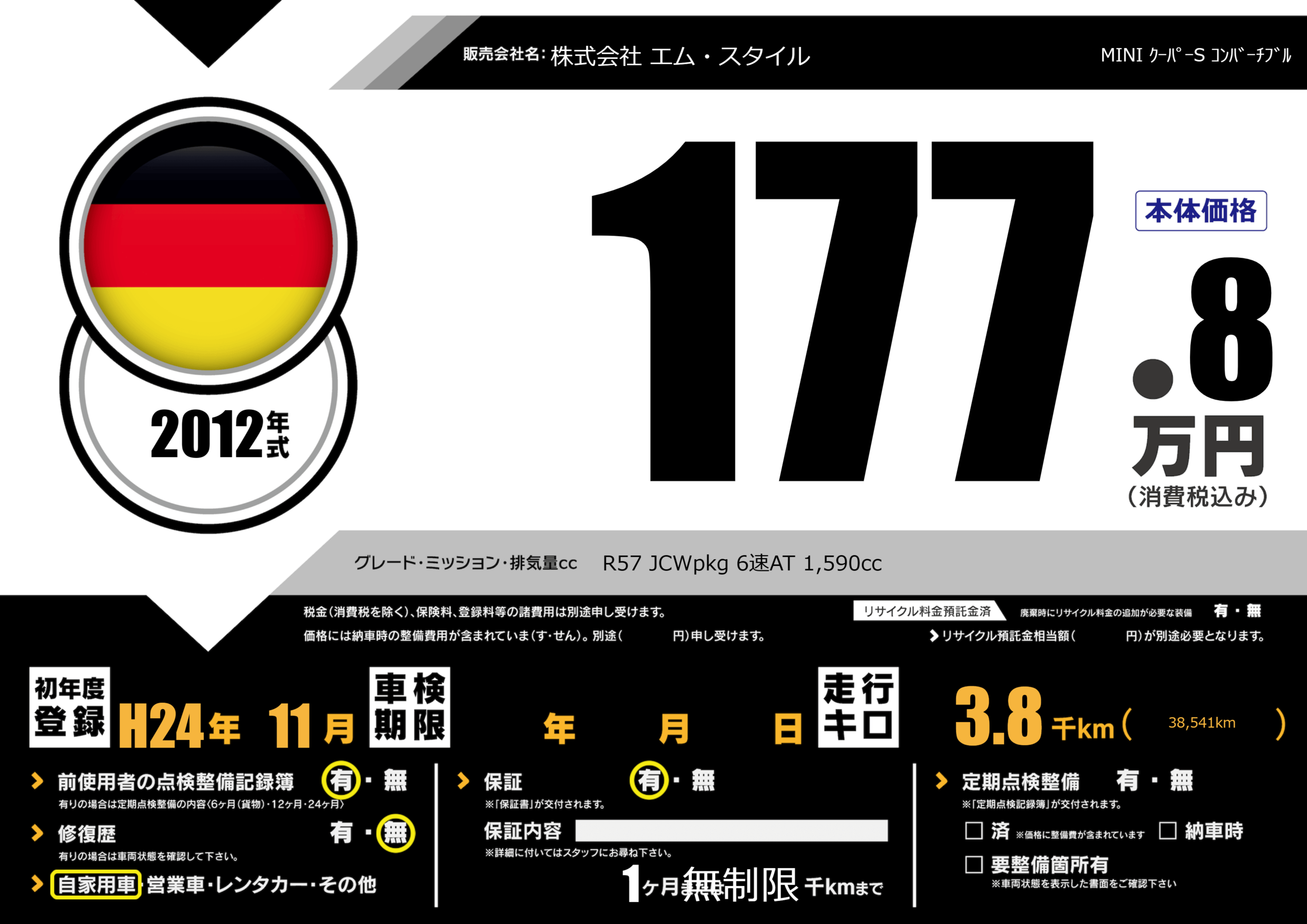 | 車名 | MINI クーパーS コンバーチブル | グレード ミッション 排気量 |