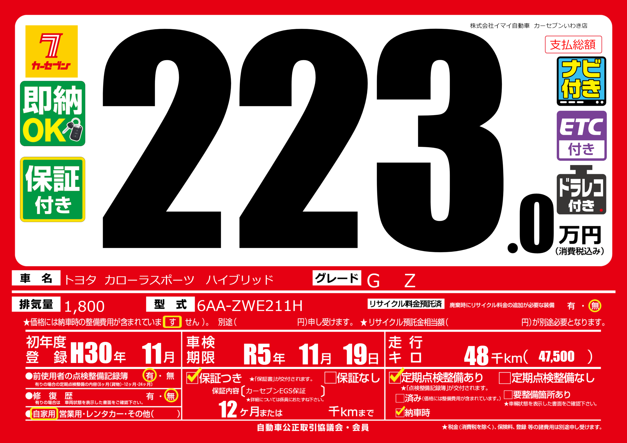 | 走行キロ | 4.8万km | 初年度登録 | H30年11月 |