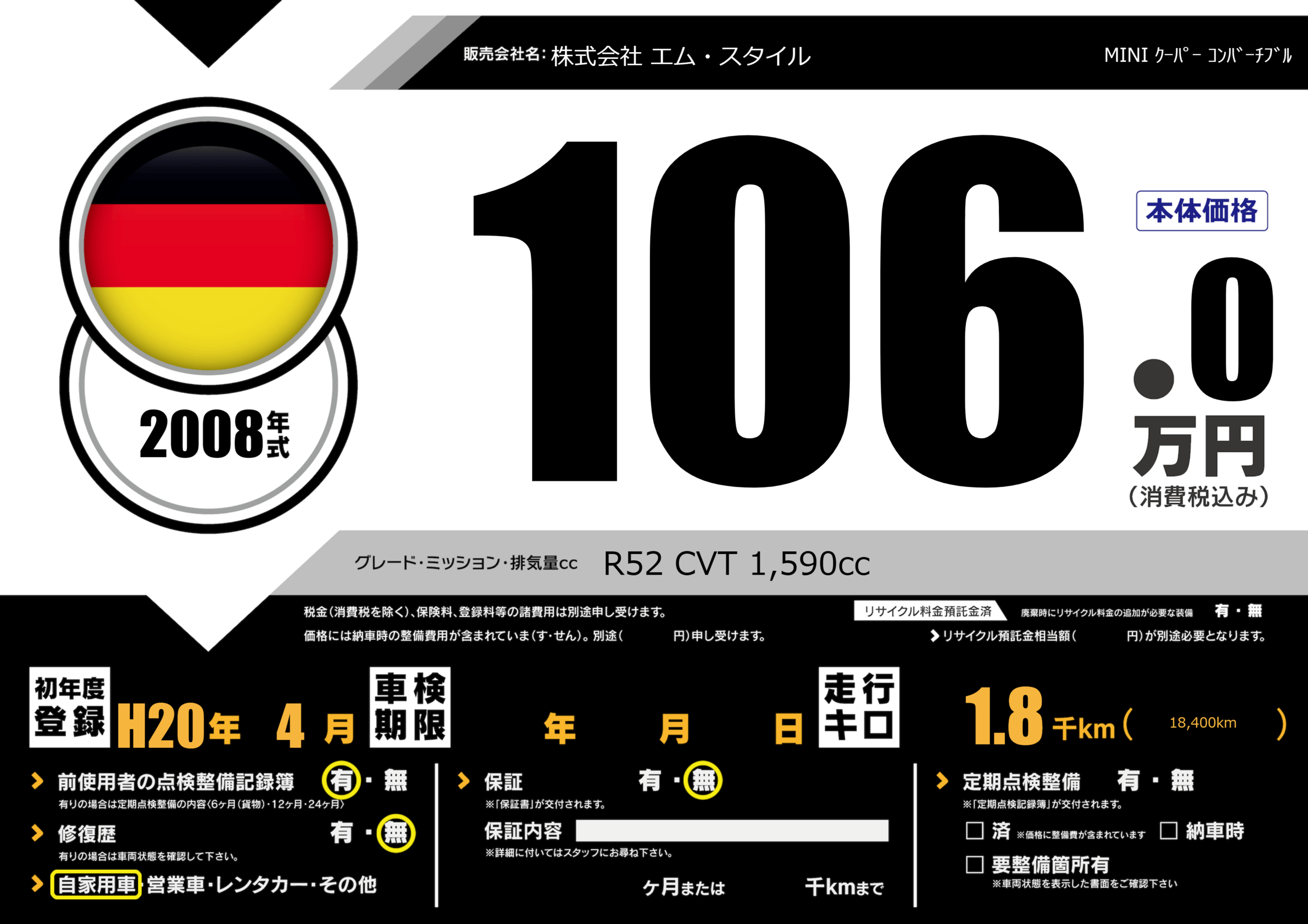 | 車名 | MINI クーパー コンバーチブル | グレード ミッション 排気量 |