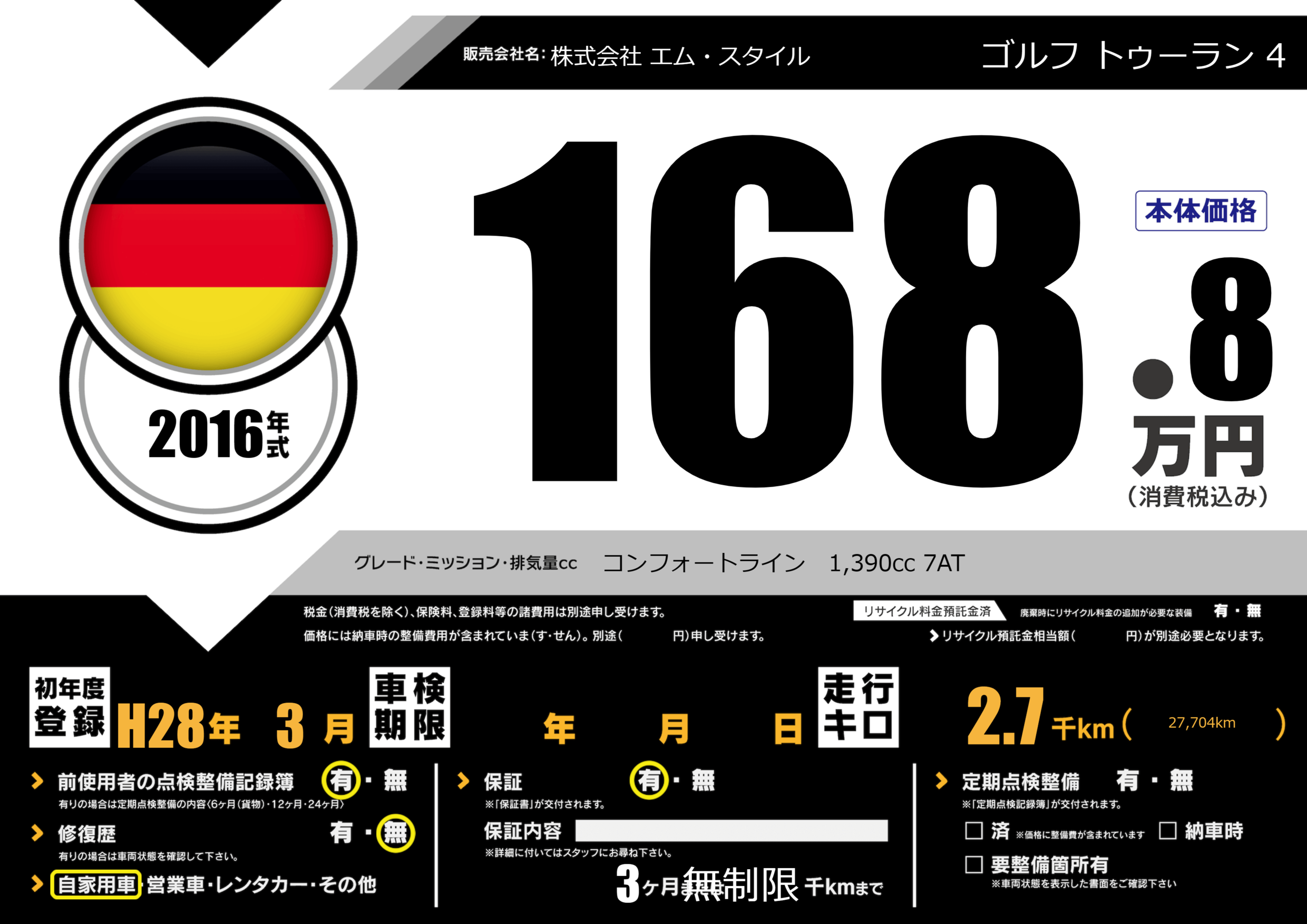 | 車名 | ゴルフ トゥーラン 4 | グレード ミッション 排気量 |