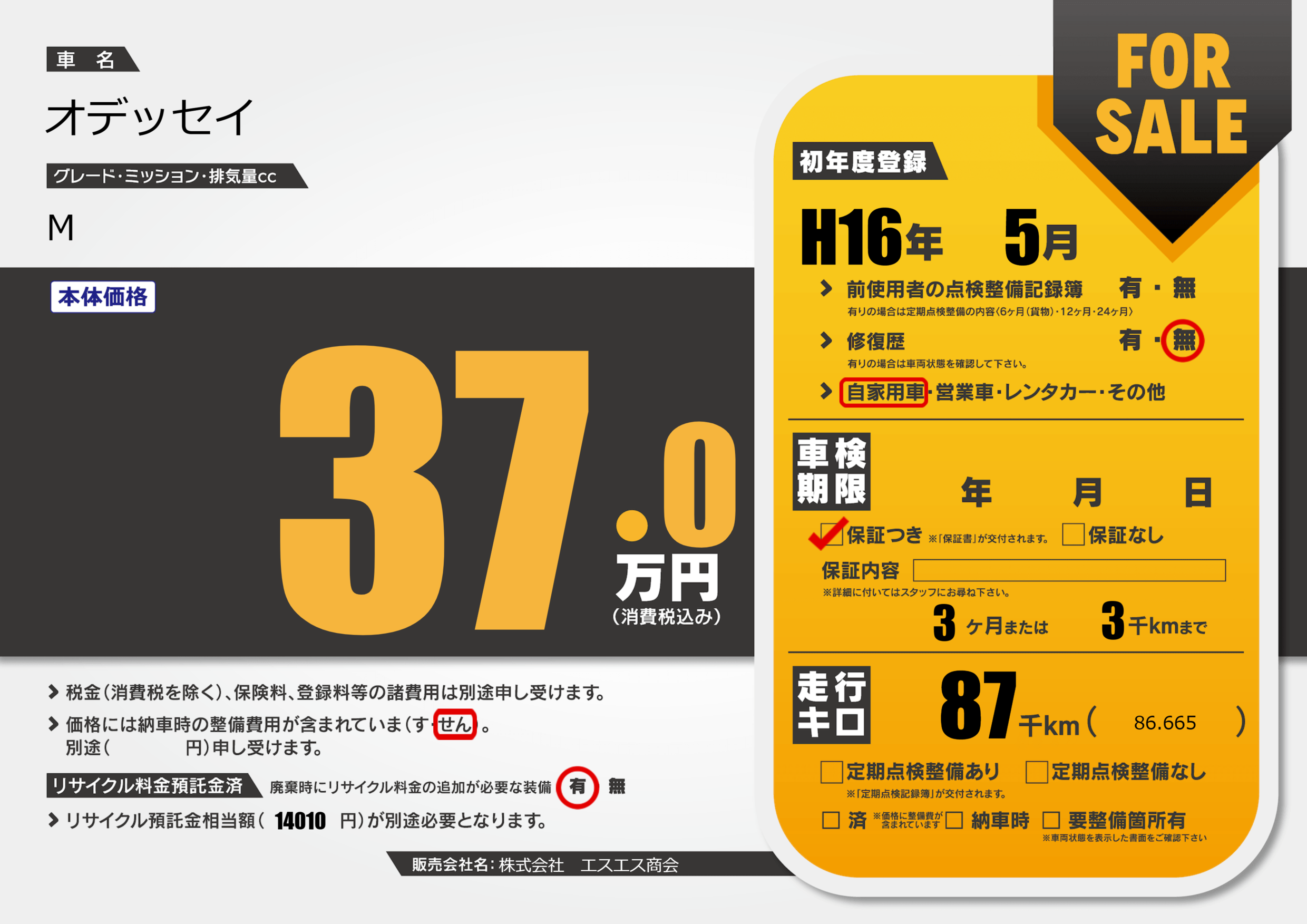 | 走行キロ | 8.7万km | 初年度登録 | H16年5月 |