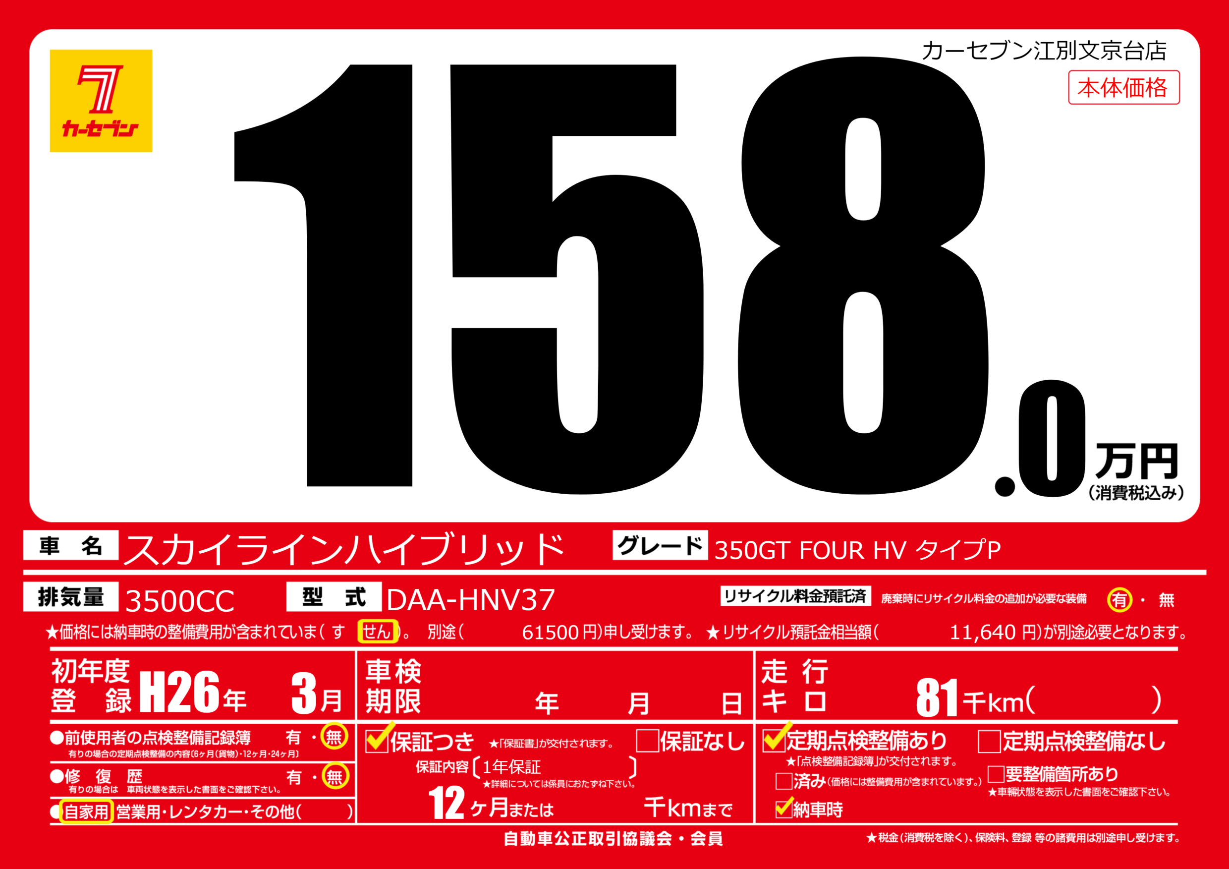 | 車名 | スカイラインハイブリッド | グレード ミッション 排気量 |
