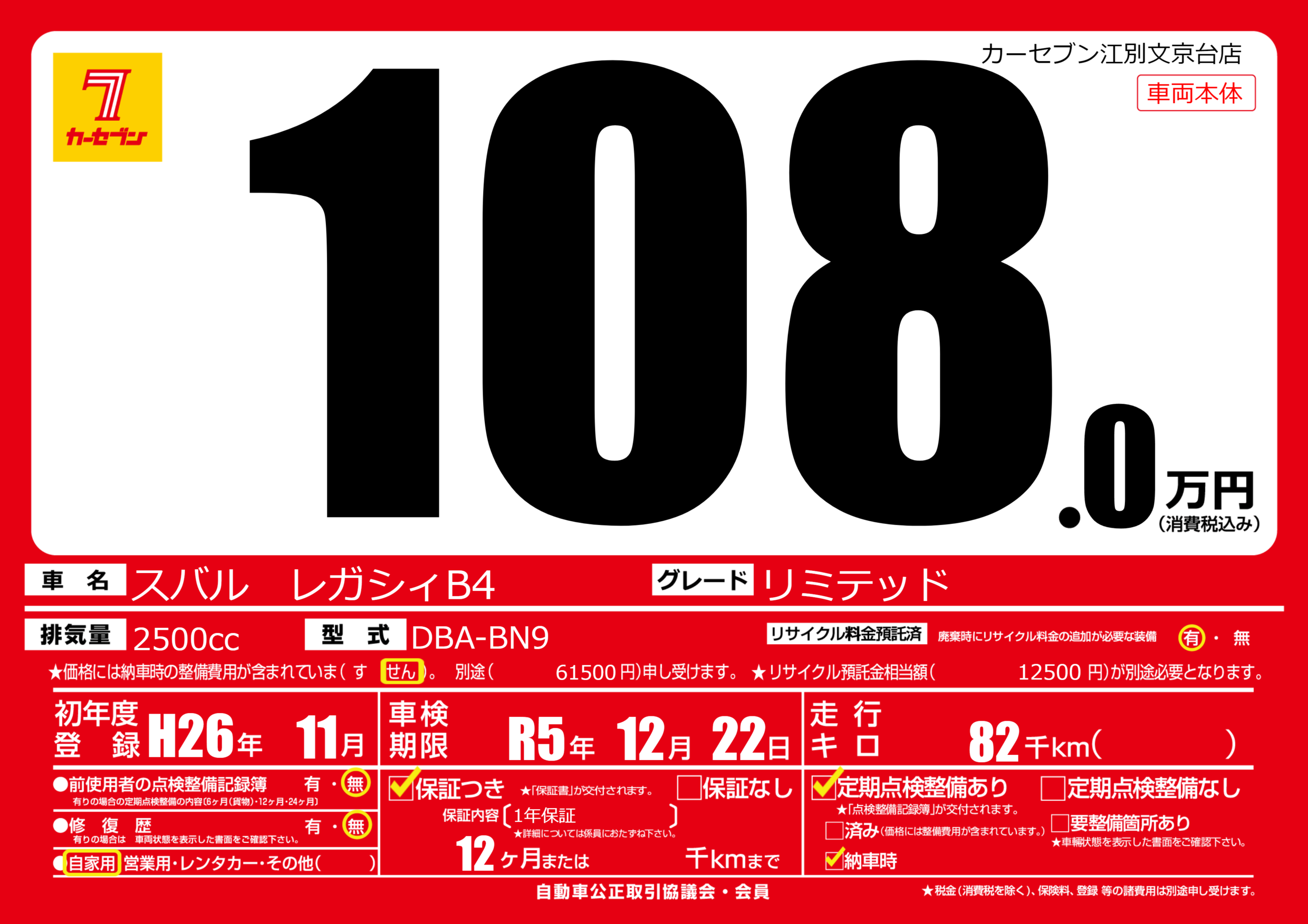 | 車名 | スバル レガシィB4 | グレード ミッション 排気量 |