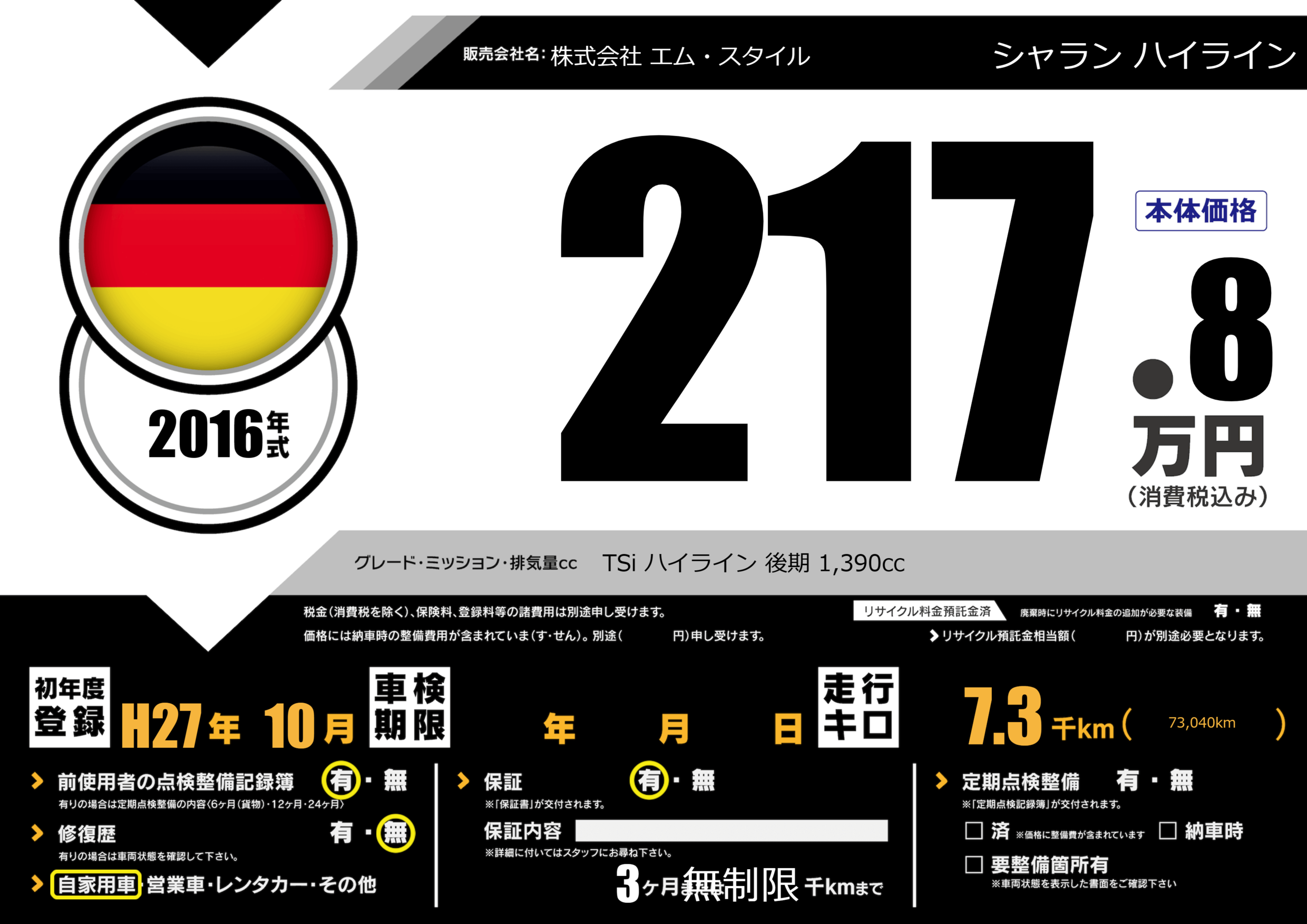 | 車名 | シャラン ハイライン | グレード ミッション 排気量 |