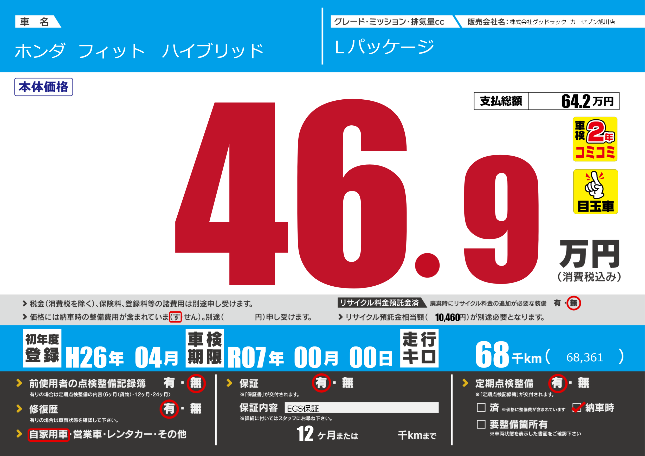 | 車検制限 | R07年 00月 00日 | ||