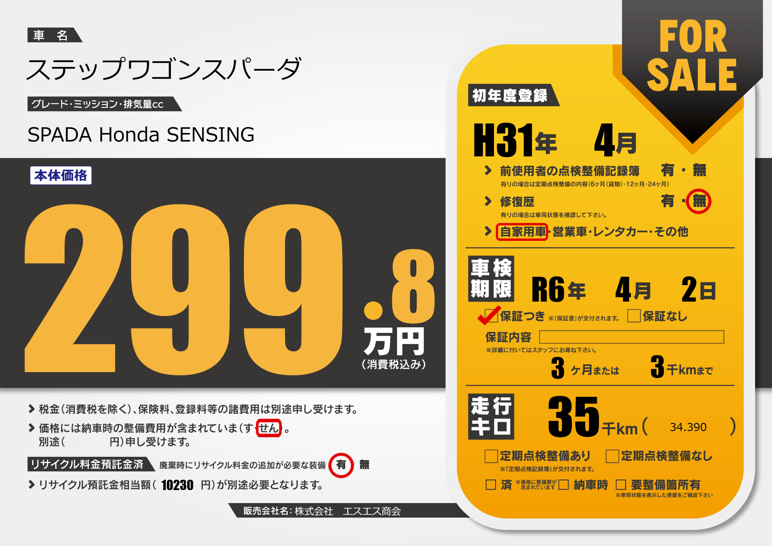 | 車名 | ステップワゴンスパーダ | グレード ミッション 排気量 |