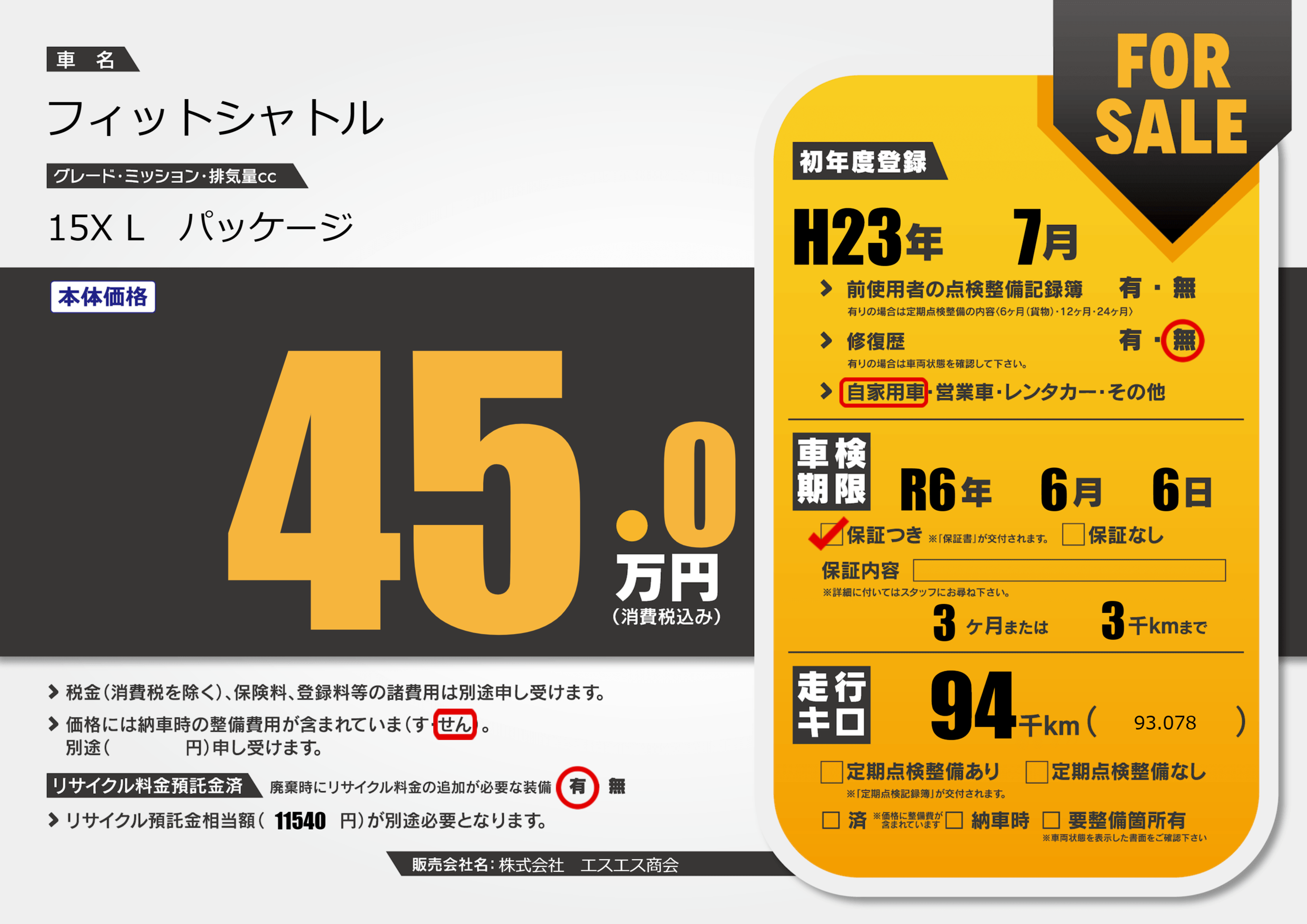| 走行キロ | 9.4万km | 初年度登録 | H23年7月 |