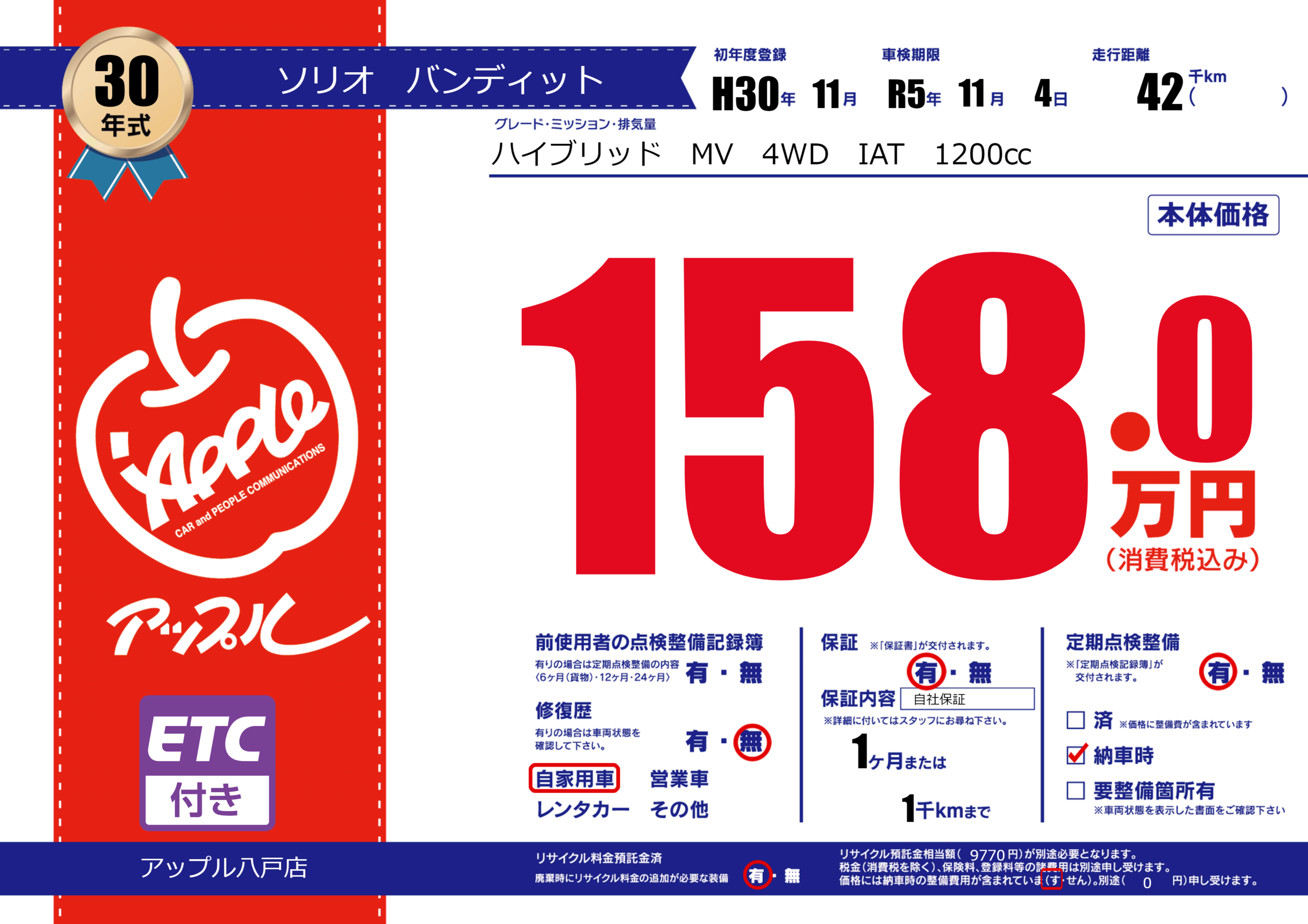 保証付き 保証内容( 自社保証) 1ヶ月または(1)千kmまで |