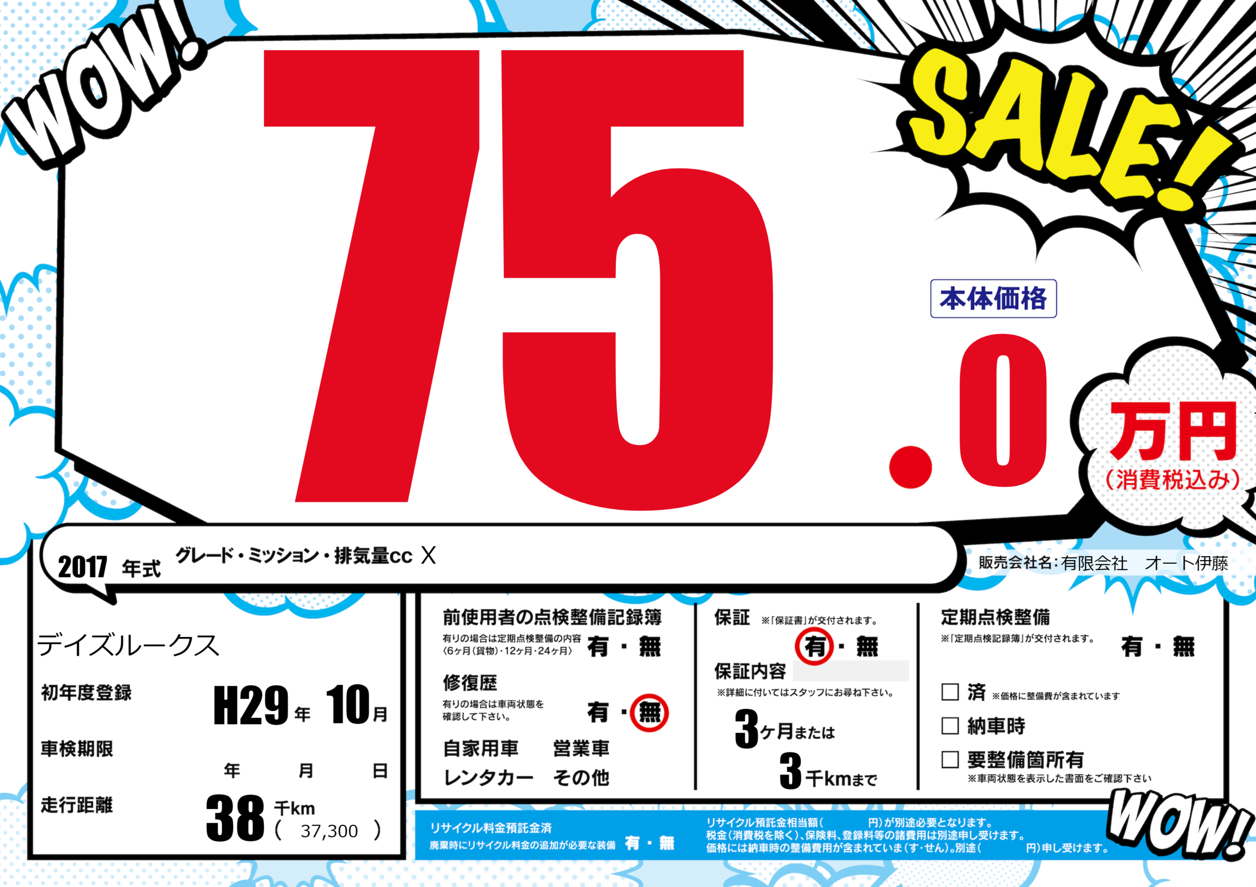 | 車名 | デイズルークス | グレード ミッション 排気量 |