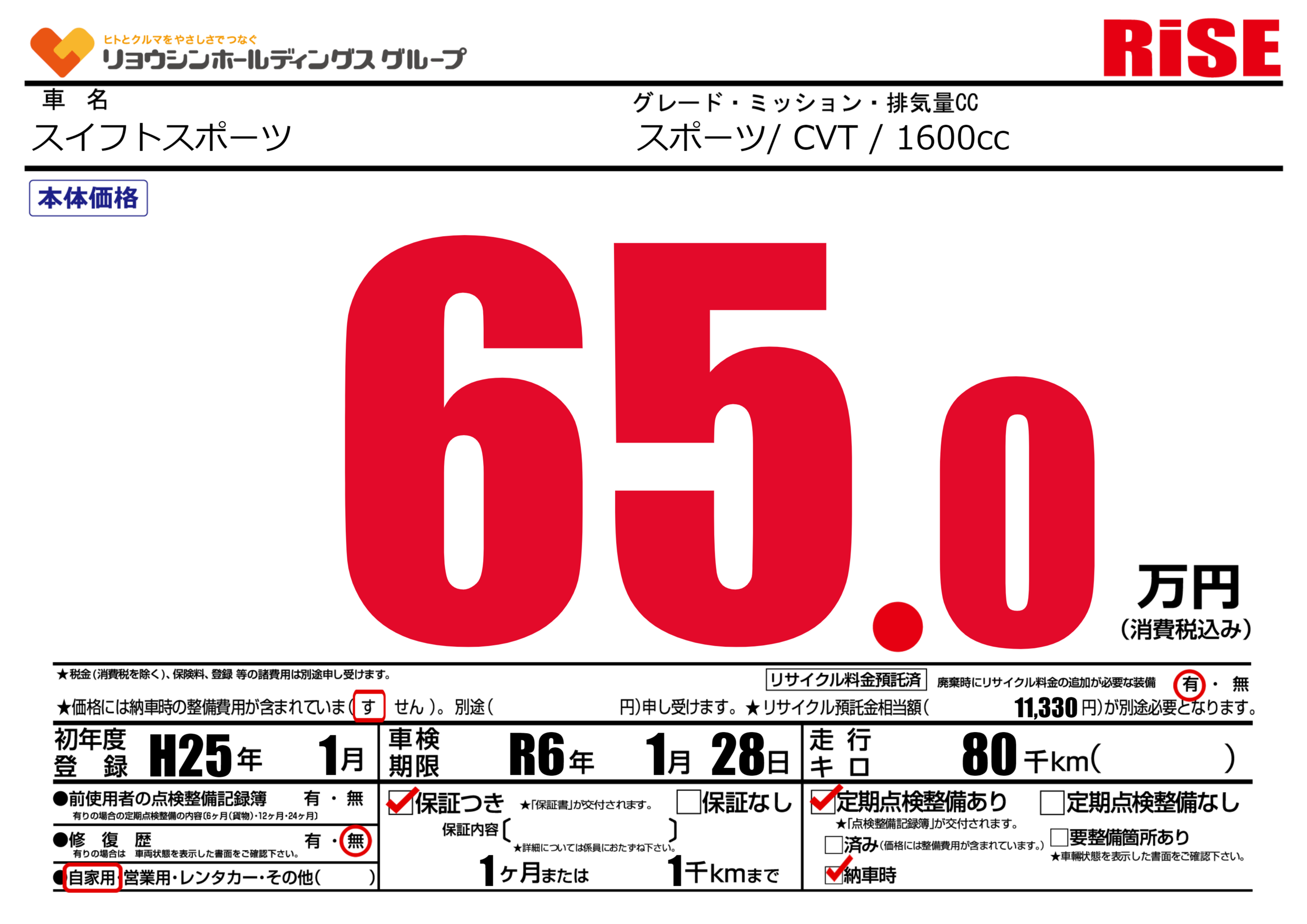 | 車名 | スイフトスポーツ | グレード ミッション 排気量 |