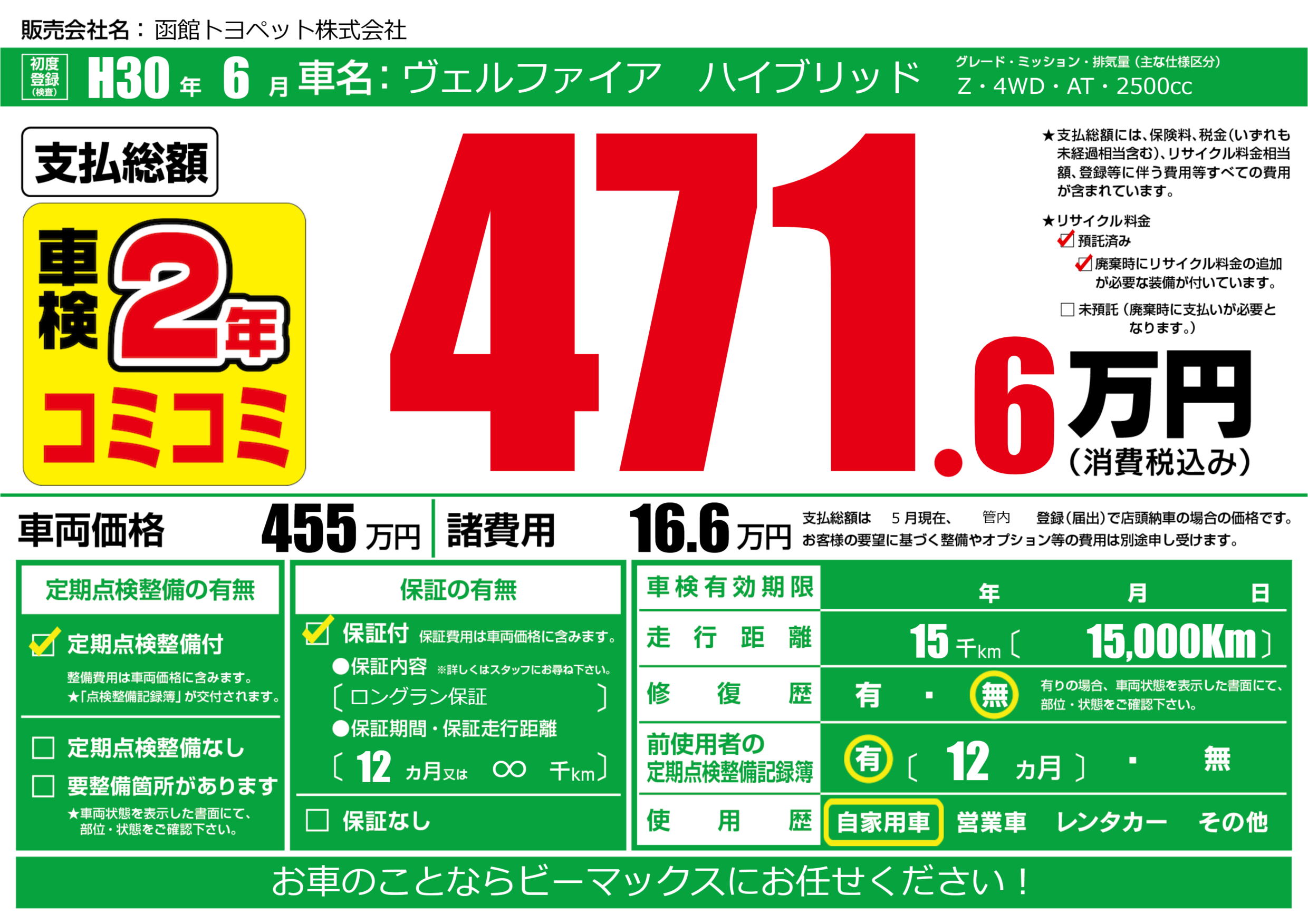 | 車名 | ヴェルファイア ハイブリッド | グレード ミッション 排気量 |