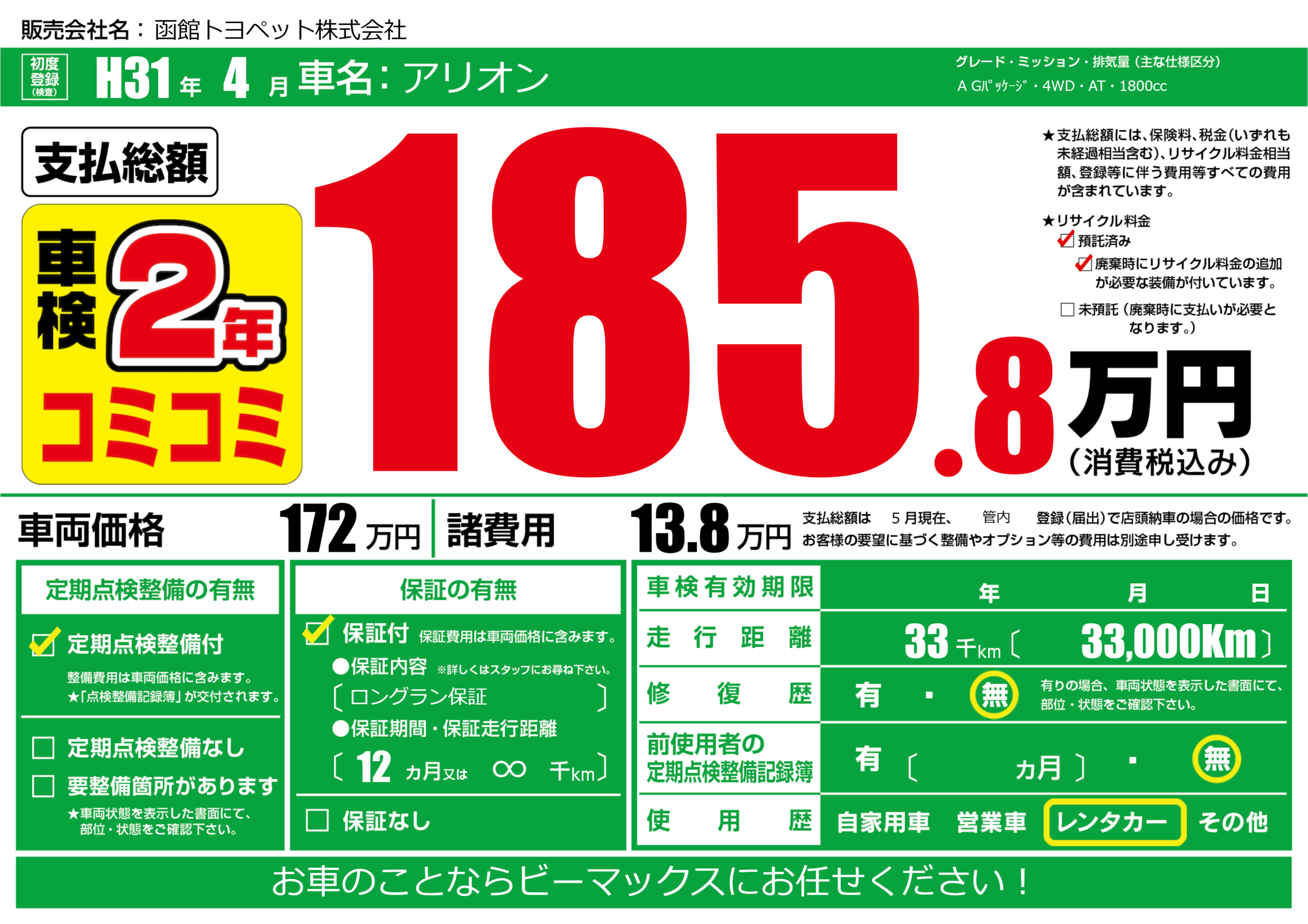 | 車名 | アリオン | グレード ミッション 排気量 |