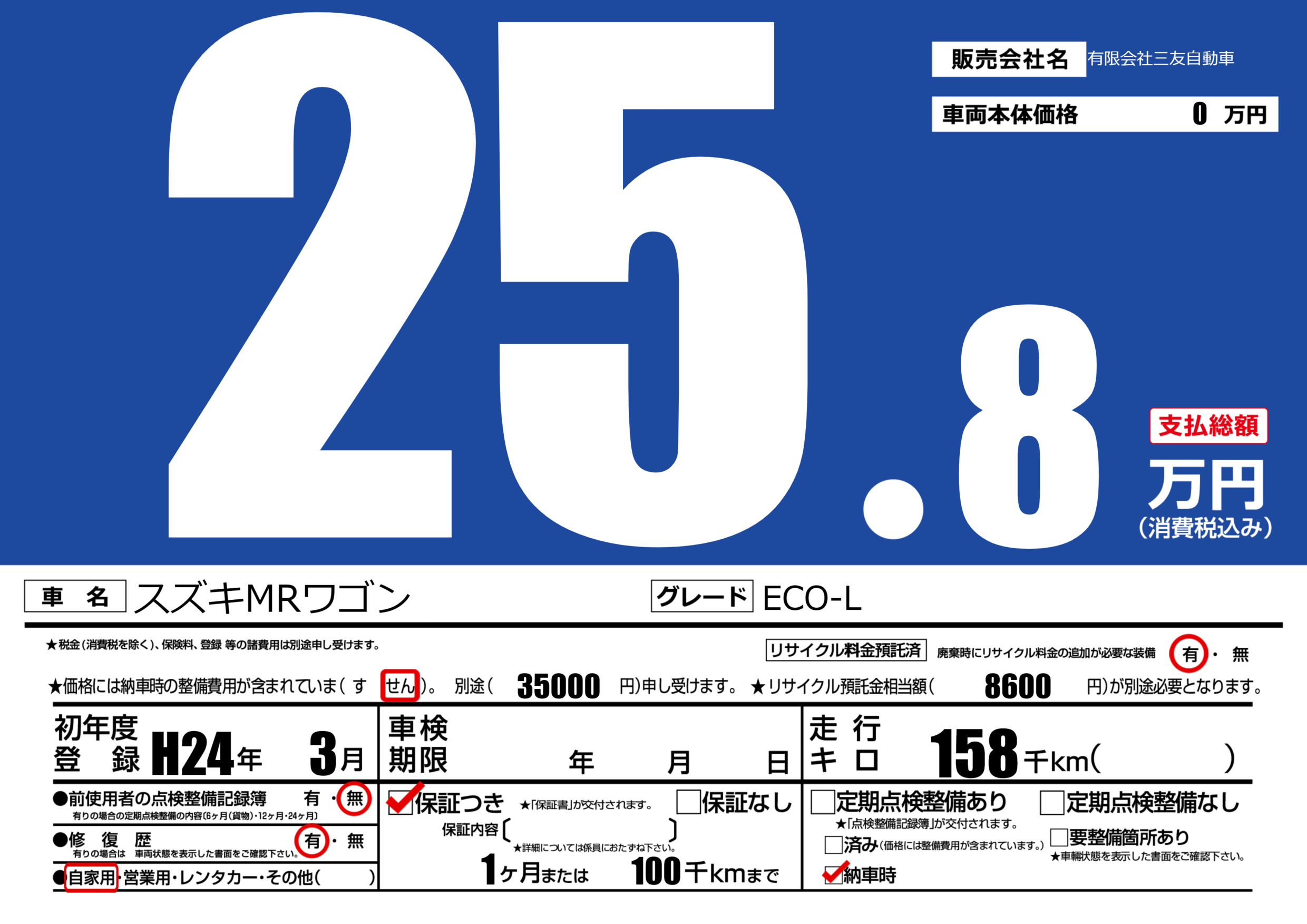 保証付き 保証内容(---) 1ヶ月または(100)千kmまで |