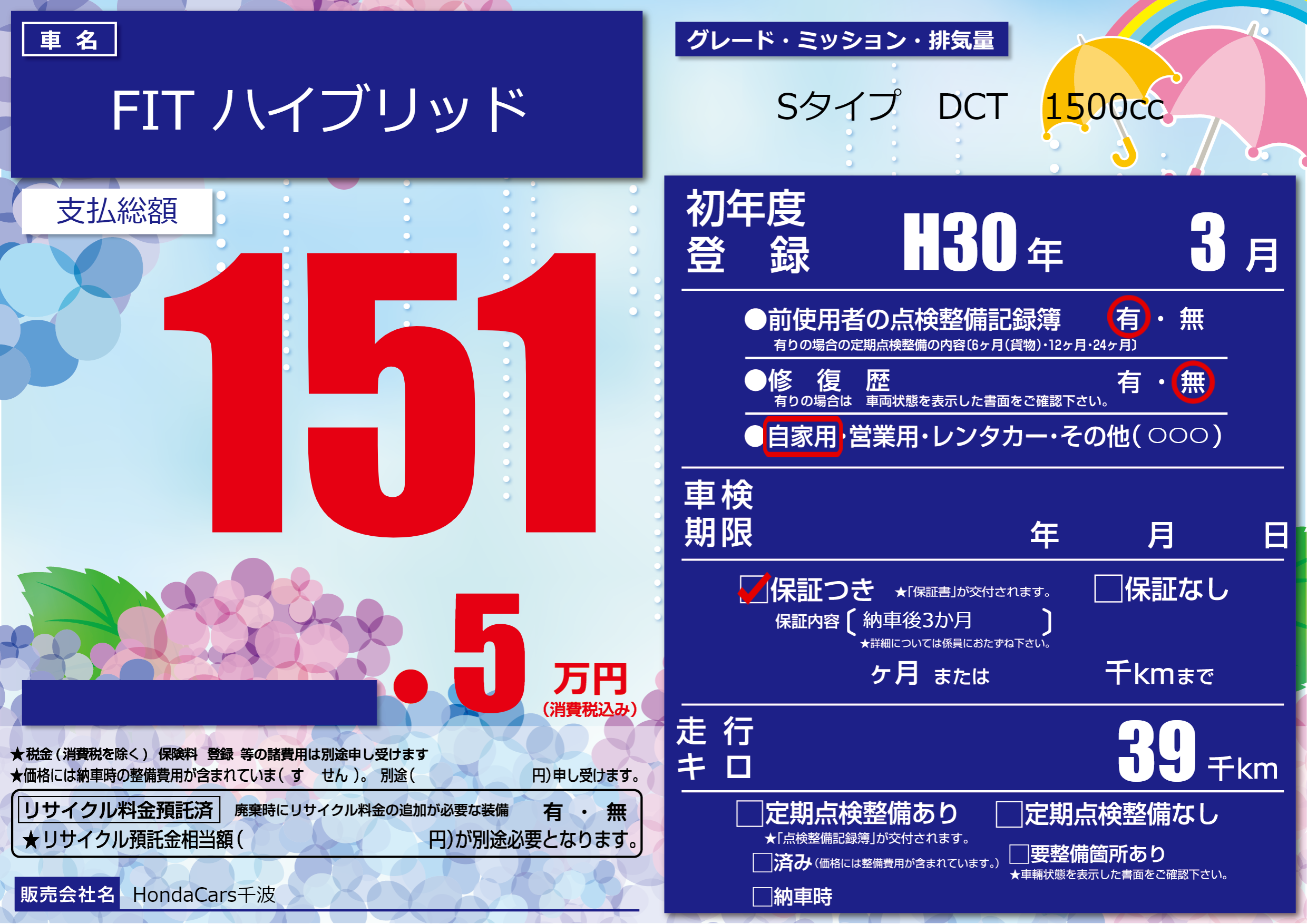 保証付き 保証内容(納車後3か月) ---ヶ月または()千kmまで |