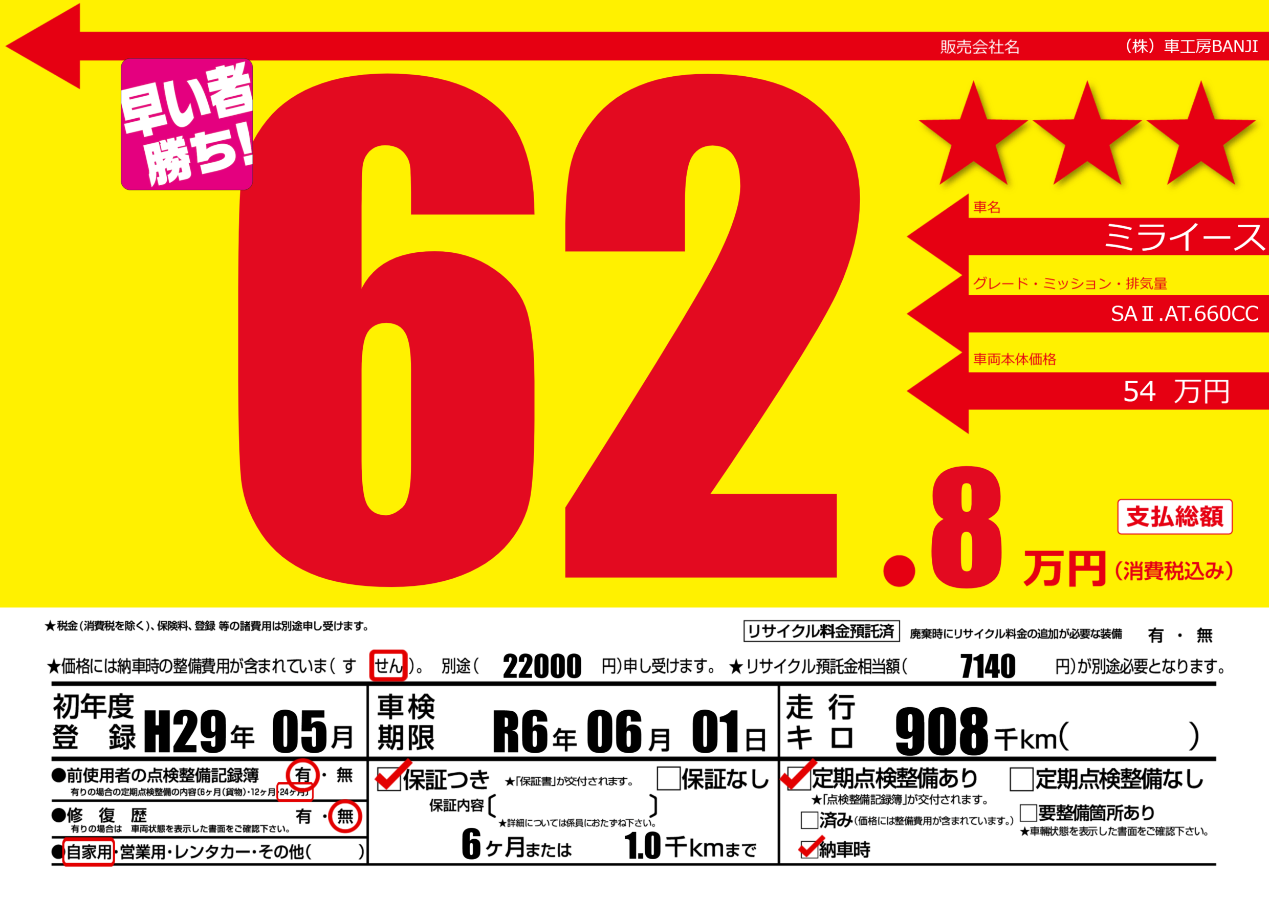 保証付き 保証内容(---) 6ヶ月または(1.0)千kmまで |