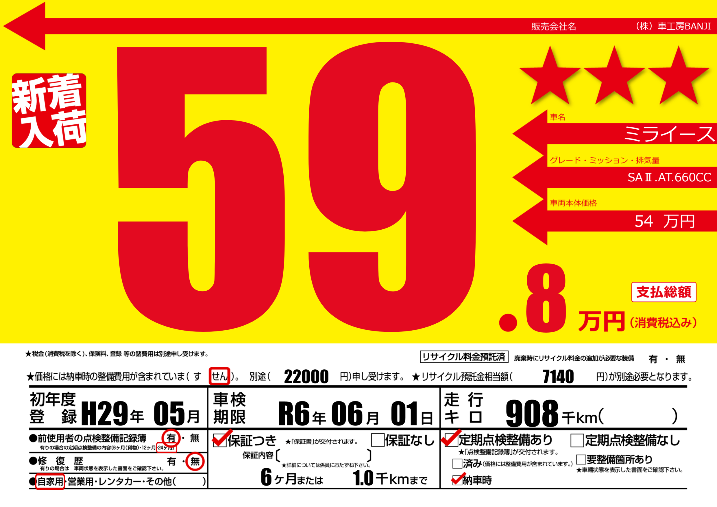保証付き 保証内容(---) 6ヶ月または(1.0)千kmまで |