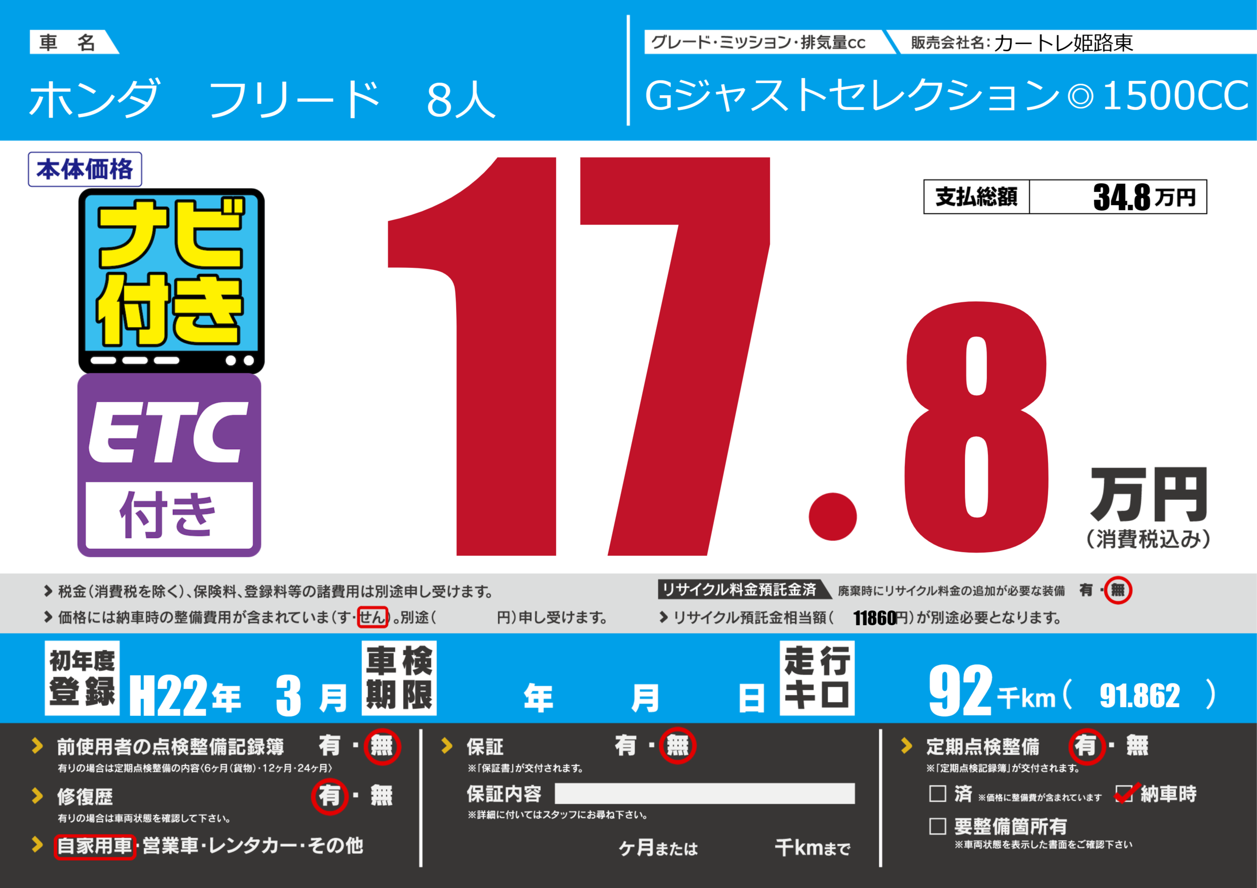 | 車名 | ホンダ フリード 8人 | グレード ミッション 排気量 |
