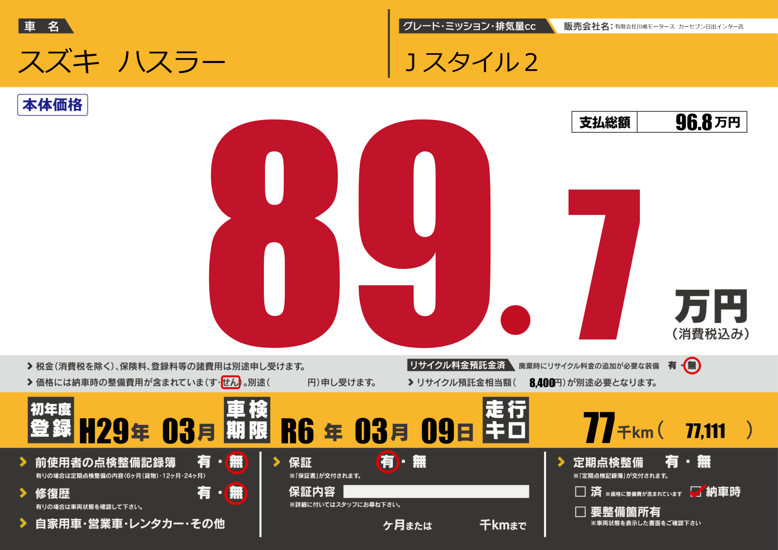 | 車名 | スズキ ハスラー | グレード ミッション 排気量 |