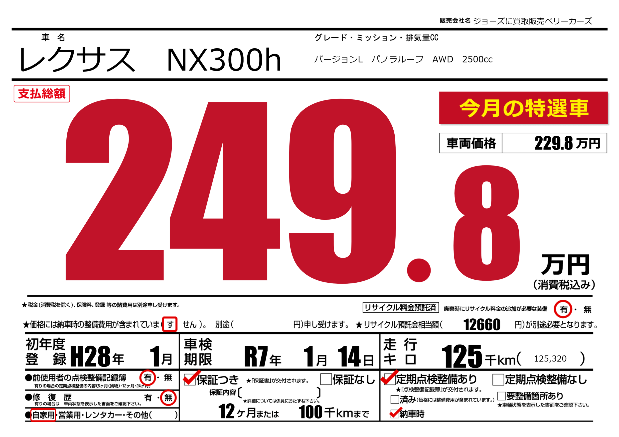 | 車名 | レクサス NX300h | グレード ミッション 排気量 |