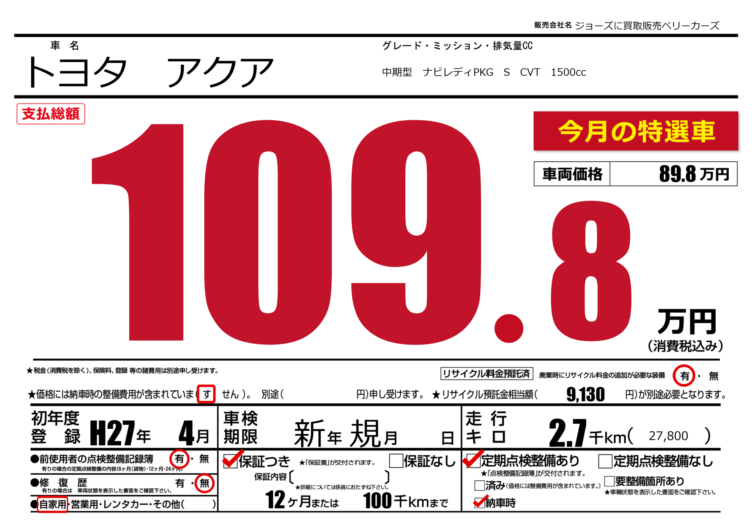 保証付き 保証内容(---) 12ヶ月または(100)千kmまで |