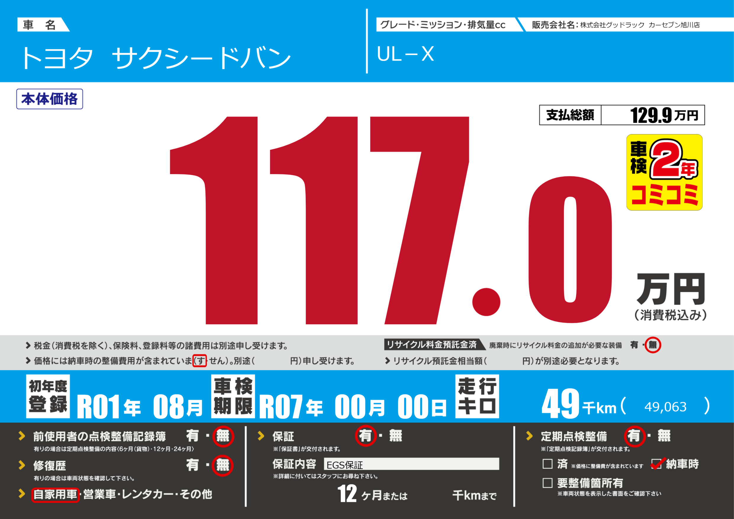 | 車名 | トヨタ サクシードバン | グレード ミッション 排気量 |