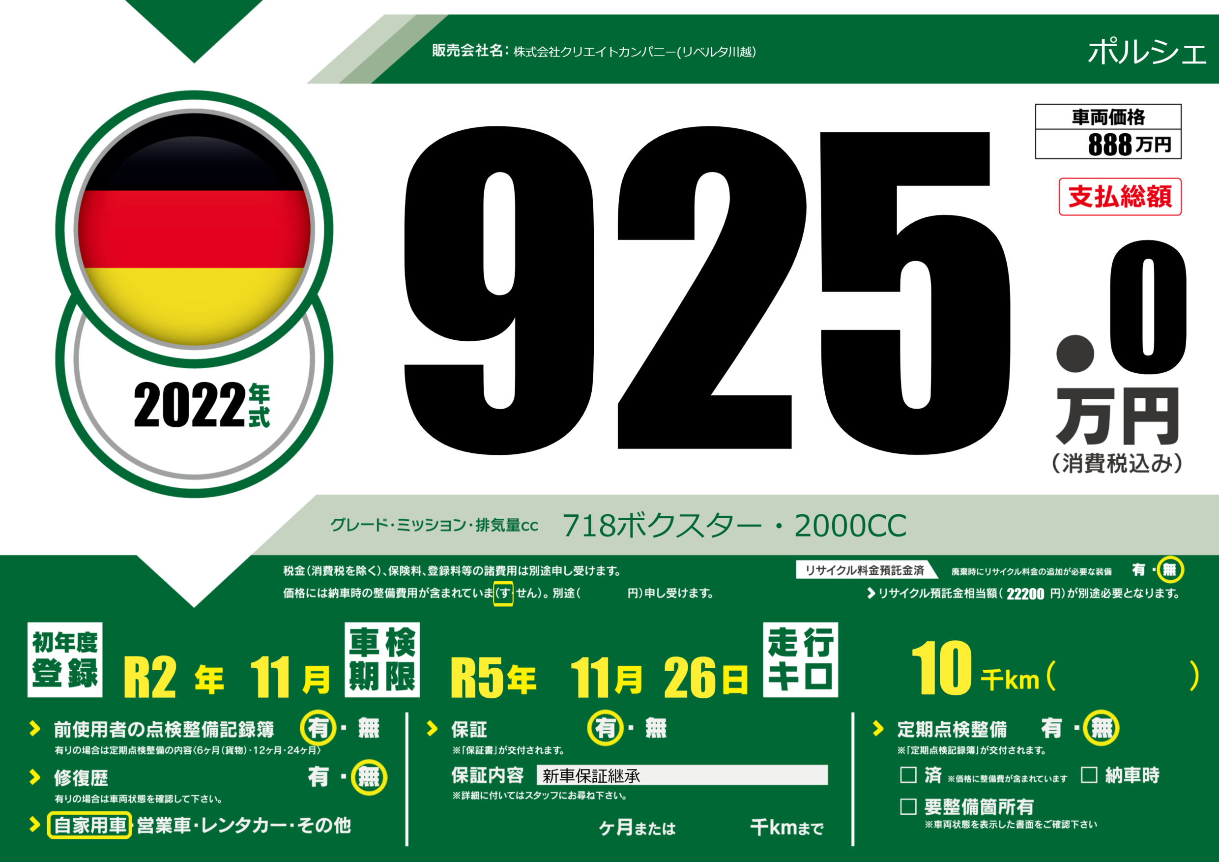 | 車名 | ポルシェ | グレード ミッション 排気量 |
