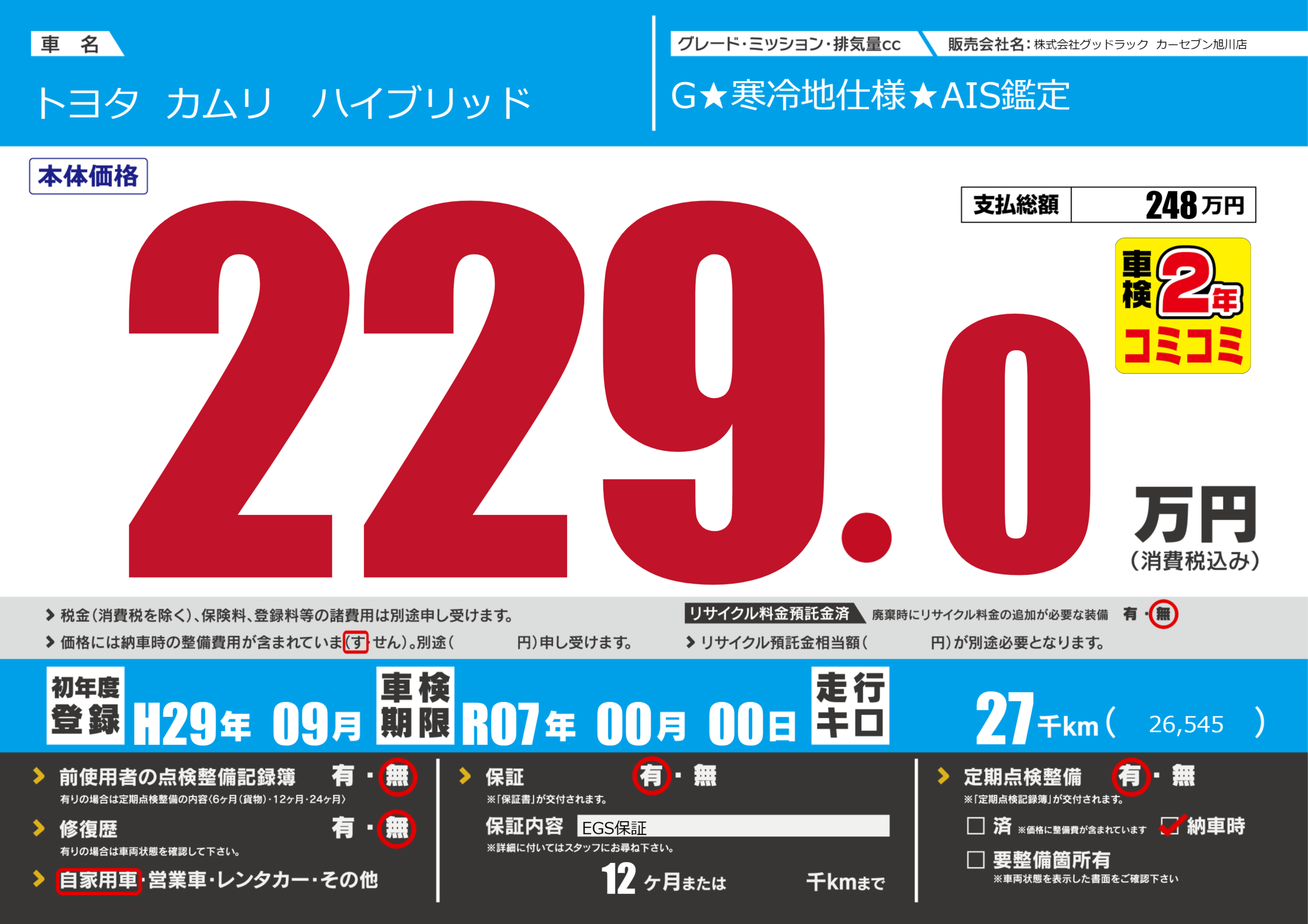 | 走行キロ | 2.7万km | 初年度登録 | H29年09月 |