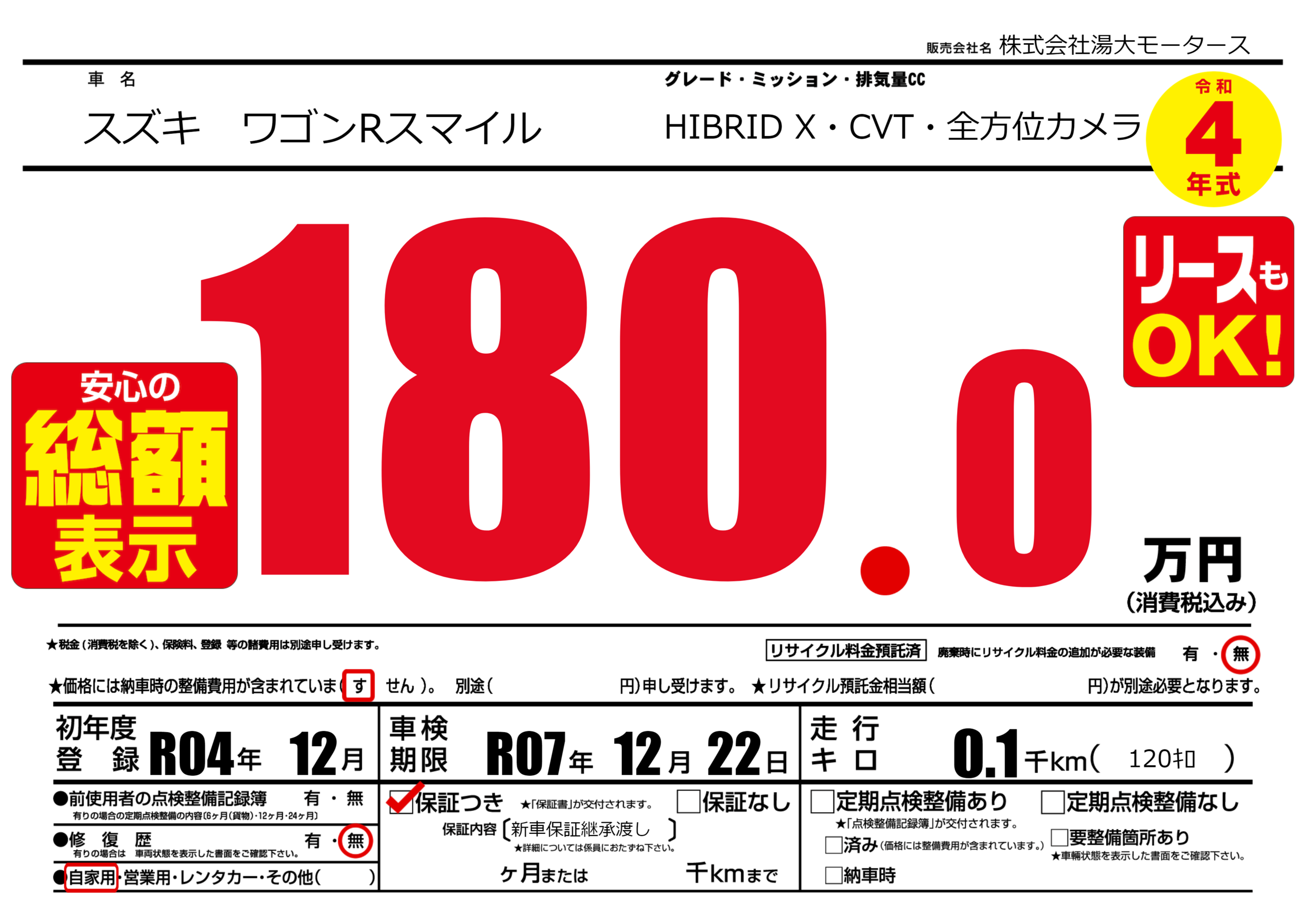 | 車名 | スズキ ワゴンRスマイル | グレード ミッション 排気量 |